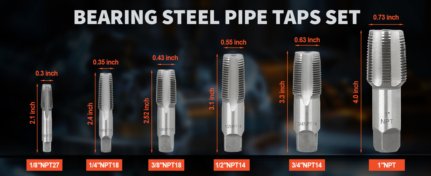 • 【نطاقات متعددة المقاسات】: مجموعة الحنفية NPT تأتي مع ستة أحجام متنوعة من تركيبات الأنابيب: 1 بوصة، 3/4 بوصة، 1/2 بوصة، 3/8 بوصة، 1/4 بوصة، و1/8 بوصة، مما يضمن وصلات محكمة الغلق وموثوقة، وتلبي احتياجات معالجة خيط الأنابيب المختلفة.