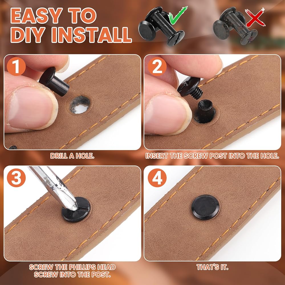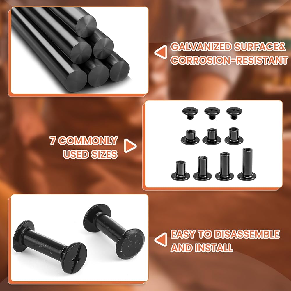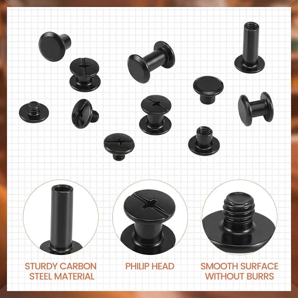 فولاذ كربوني متين: براغي شيكاغو مصنوعة من فولاذ كربوني قوي مع سطح أملس وخالي من الاختباء. يوفر الطلاء الأسود المعدني القوي مقاومة للماء ومتانة استثنائية للمشروعات الجلدية طويلة الأمد.