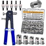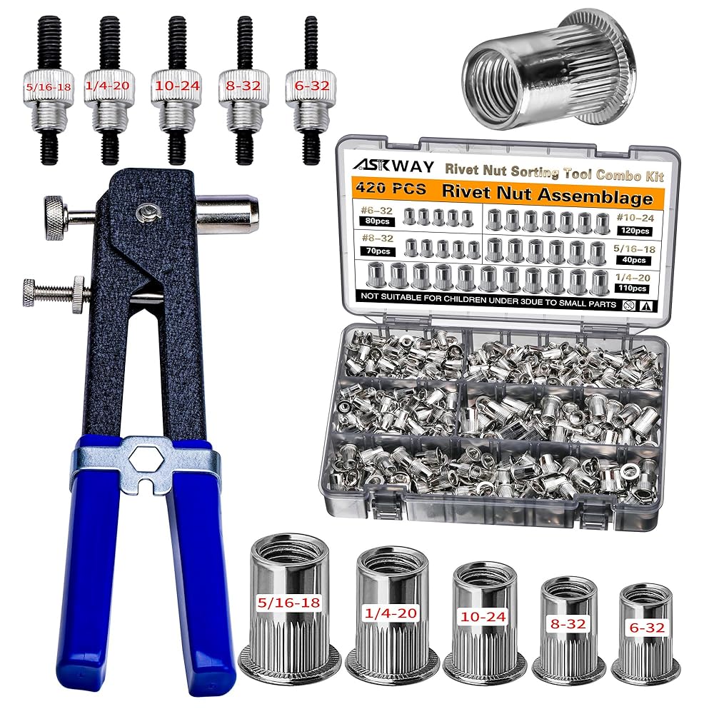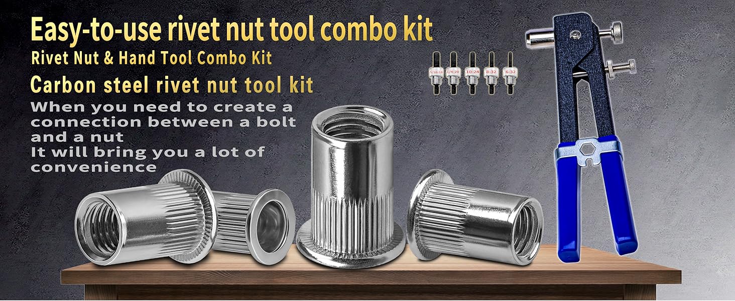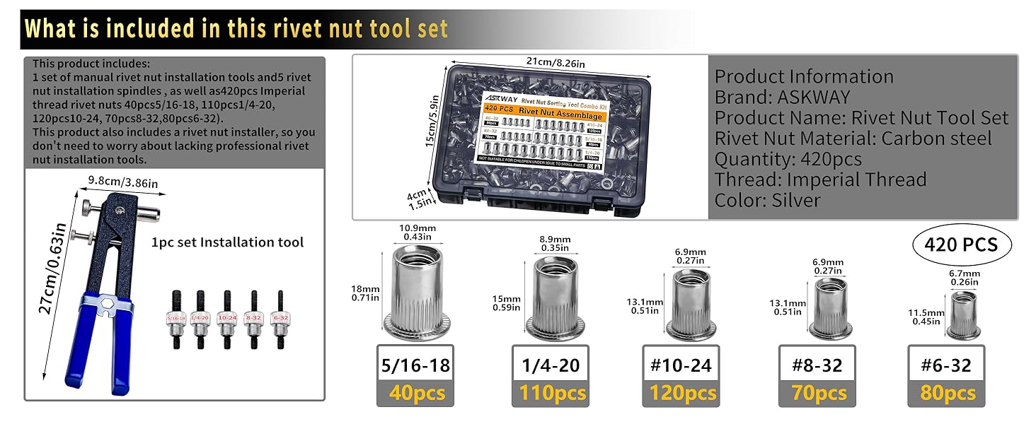 [حول هذا المشروع]: تتضمن مجموعة أدوات صامولة البرشام مجموعة قطعة واحدة من أدوات صامولة البرشمة اليدوية، مما يوفر صواميل برشام في 5 أحجام من الخيوط الإمبراطورية: 80 قطعة 6-32، 70 قطعة 8-32، 120 قطعة 10-24، 110 قطعة 1/4-20، و40 قطعة 5/16-18، بإجمالي 420 قطعة من الفولاذ الكربوني ذو الخيط الإمبراطوري صواميل برشام، والتي يمكن أن تلبي احتياجاتك اليومية المختلفة.