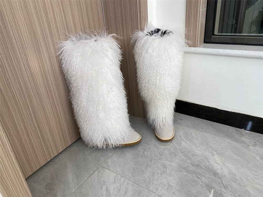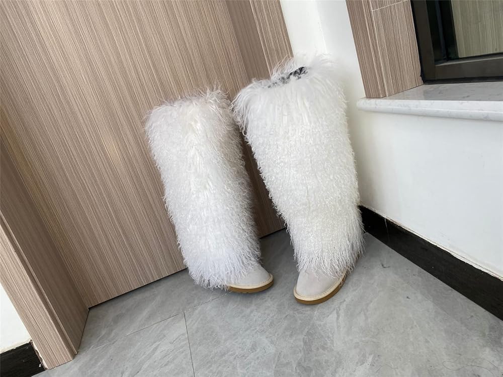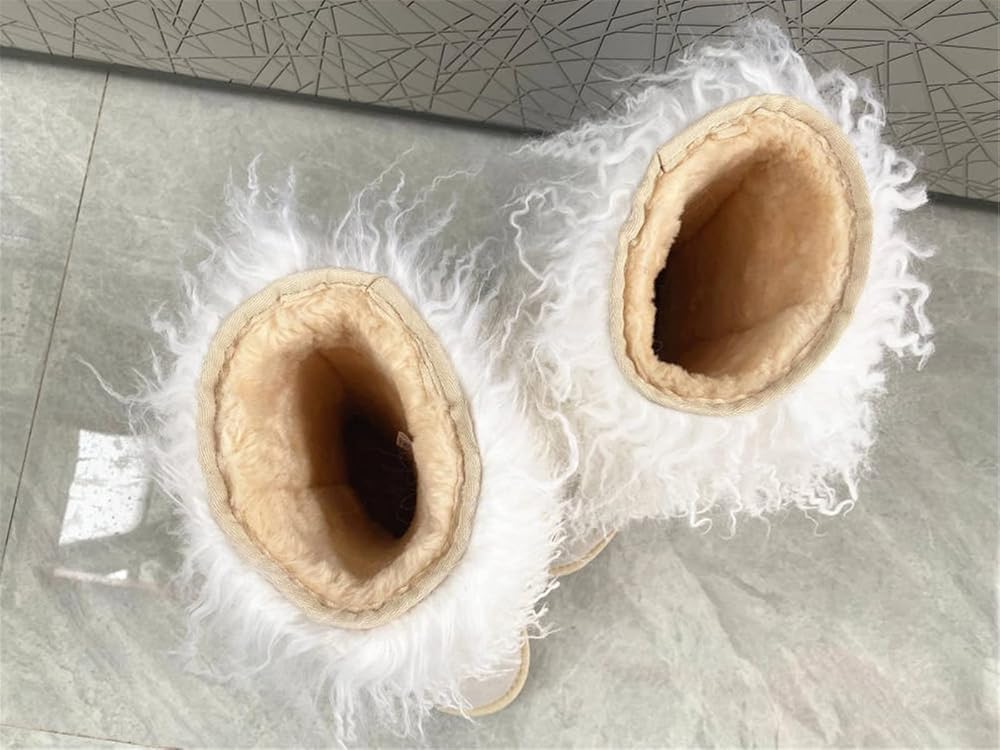 Yeti Boots النساء أحذية الفراء المنغولية مع حقيقي التبتية رقيق فروي الأغنام مجعد الجلد الثلوج التمهيد للسيدات الفاخرة شتاء دافئ ارتداء في الهواء الطلق الفتيات لينة Linning أسود أبيض اللون طويل القامة أحذية عالية