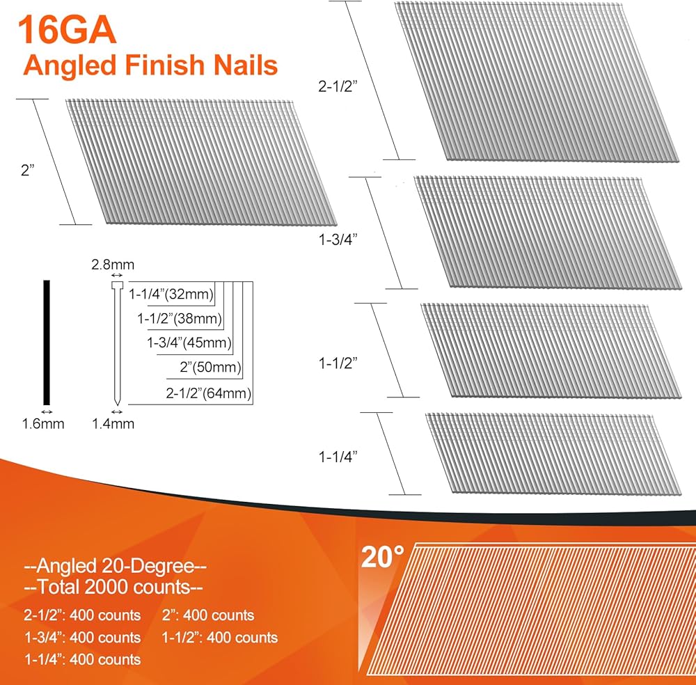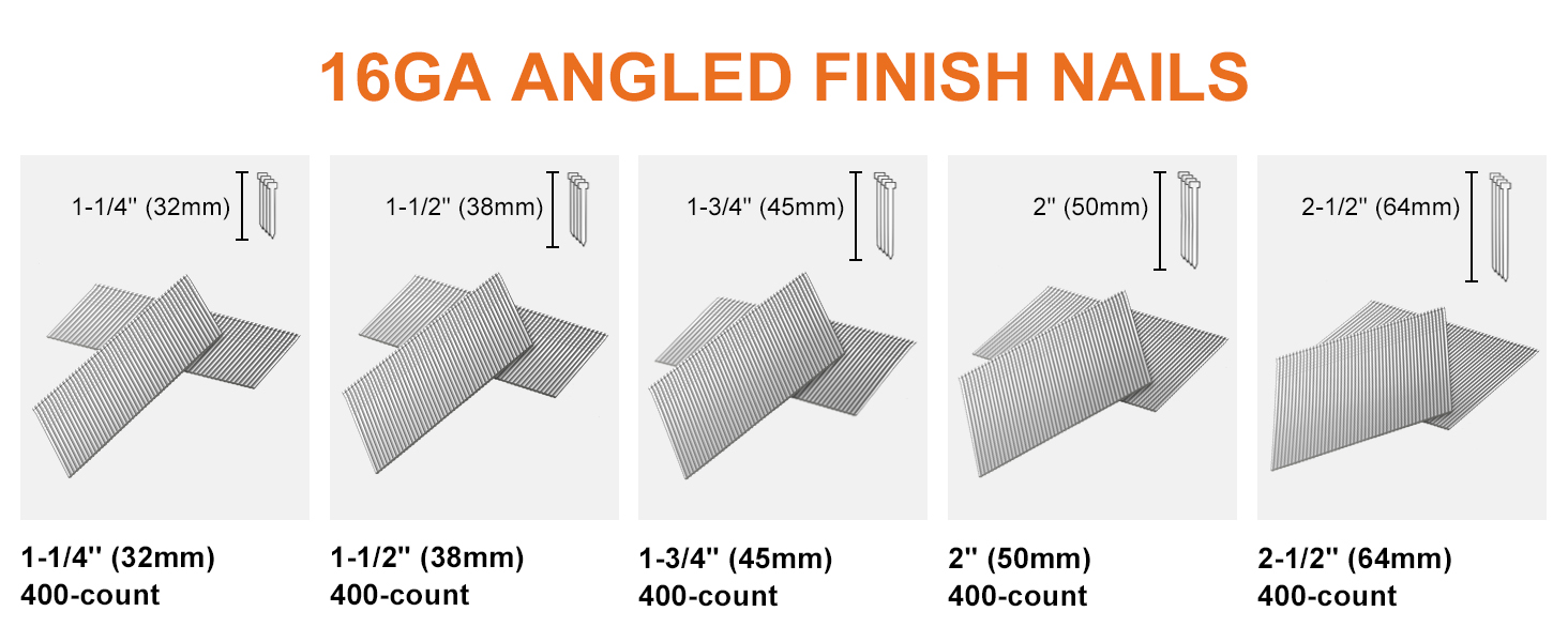 【مجموعة أظافر الكل في واحد】- تتضمن هذه المجموعة 5 أحجام من المسامير المجلفنة ذات 16 قياس 20 درجة (2-1/2 بوصة، 2 بوصة، 1-3/4 بوصة، 1-1/2 بوصة، 1-1/4 بوصة - 400 قطعة لكل منها). توفر الأحجام المختلفة يمكن أن يلبي احتياجات التثبيت المختلفة الخاصة بك ويساعدك على حل المشاريع المختلفة