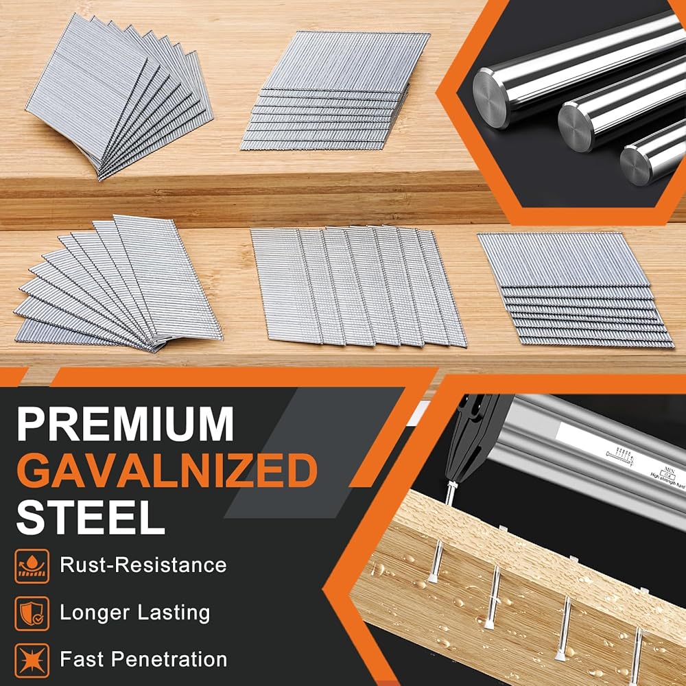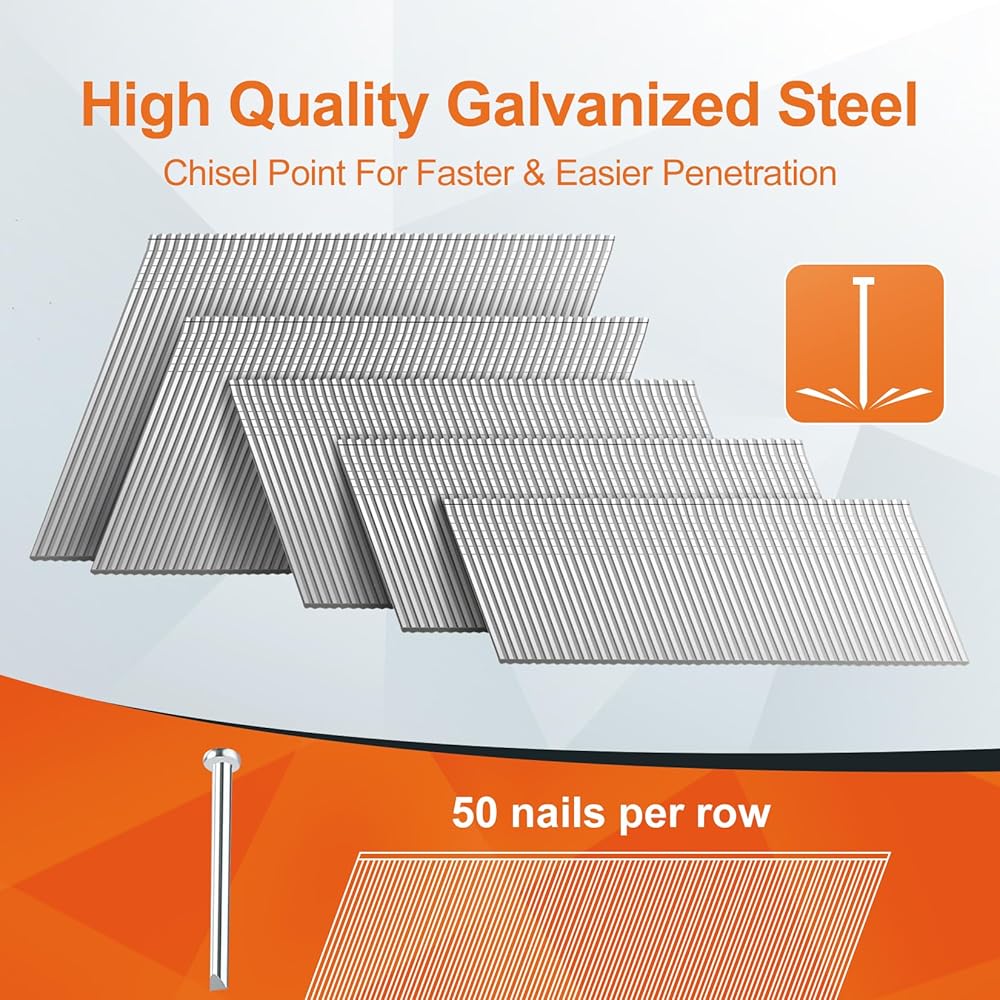 【فولاذ مجلفن متين وقوي】- هذه المجموعة من مسامير الإطار بزاوية 16 جيجا مصنوعة من الفولاذ المجلفن عالي الجودة، مما يوفر مقاومة ممتازة للصدأ والتآكل؛ تم اختبار قوة الشد القصوى (UTS) لتصل إلى 160,000 رطل لكل بوصة مربعة