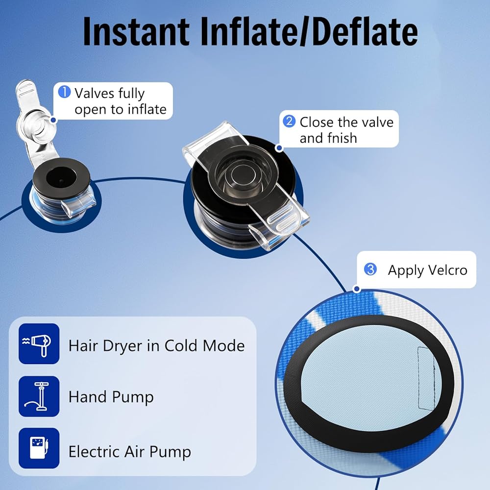 نصيحة إضافية للنفخ: يمكن نفخ أنبوب الثلج هذا بالكامل باستخدام أي مضخة هواء منزلية قياسية. إذا كانت مضختك تحتوي على فوهة مطاطية ناعمة، فقد يساعد ذلك في تكوين ختم أكثر إحكامًا مع الصمام ودعم سحب الهواء بشكل أكثر كفاءة أثناء النفخ. هذه وسيلة راحة اختيارية وليست مطلوبة للاستخدام العادي.