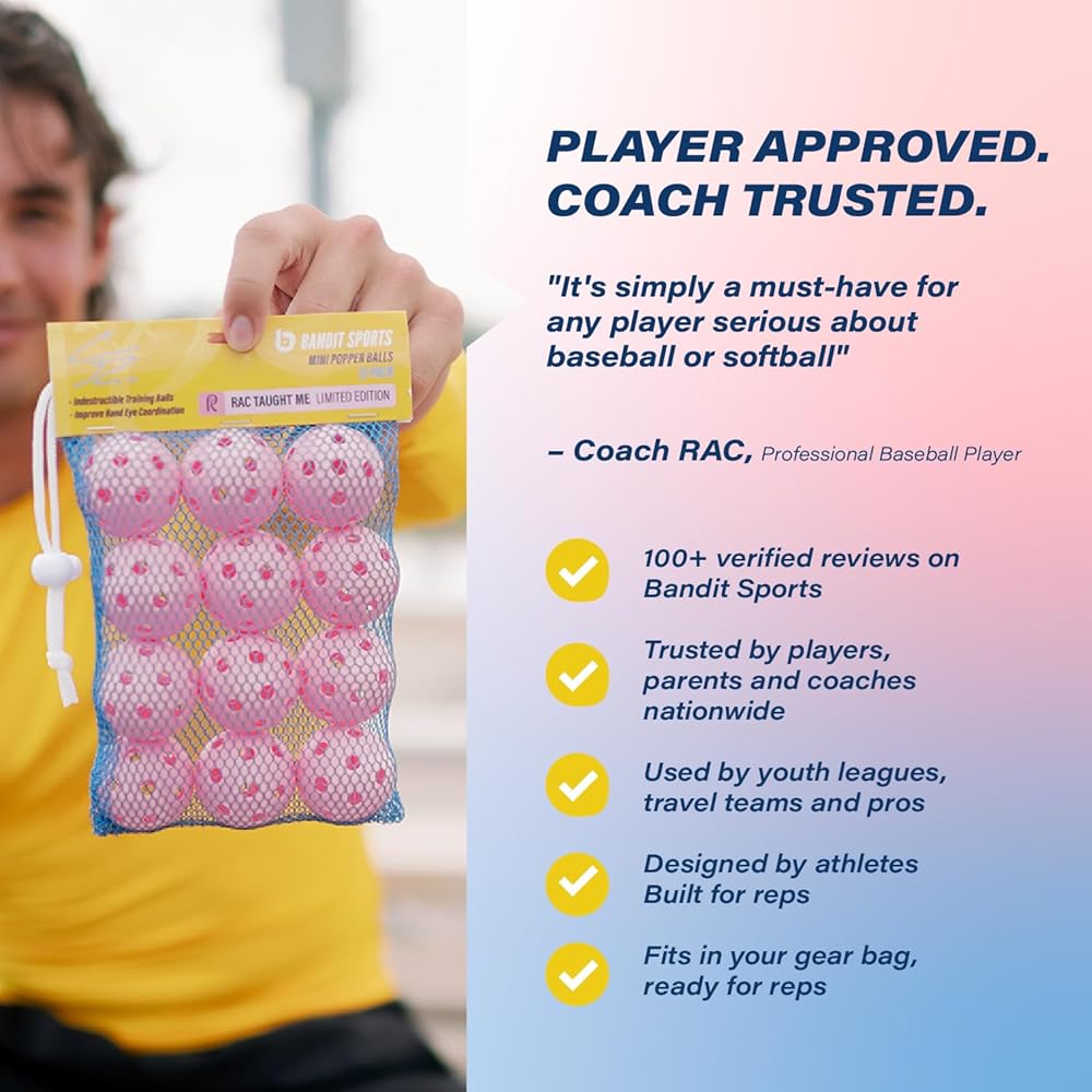 مادة متجددة: تم تصميم كرات Bandit Sports Mini Popper من مادة متينة ومرنة ومرتدة حتى لا تنكسر كرات التدريب الخاصة بك أو تتحطم أو تتشقق أو تتحطم من التأرجح الكامل