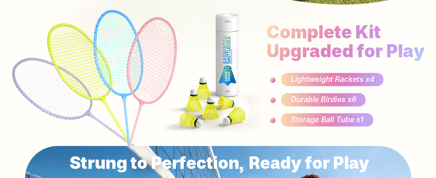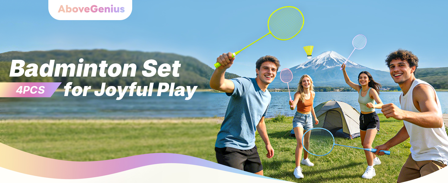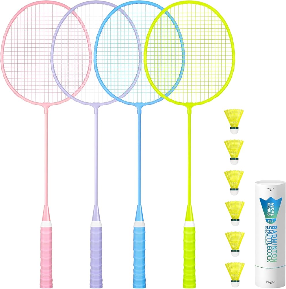 Ready for instant backyard fun? The AboveGenius Badminton Racket Set includes 4/6 high-quality rackets in vibrant Pink, Purple, Blue and Yellow, designed specifically for beginners, recreational players, and family outdoor games. Whether you're setting up for lawn parties, beach trips, camping adventures, or casual backyard matches, this complete set delivers durability, performance, and style right out of the box. Crafted with a ferroalloy frame, these rackets offer excellent impact resistance without bending or deforming—perfect for new players learning to swing with confidence. Each racket is factory-prestrung with high-elasticity nylon at 20 lbs tension, providing responsive bounce and consistent play without the need for restringing. The lightweight design (just 115g / 4.06oz per racket) ensures easy handling and reduced arm fatigue during extended play. The oversized head creates a large sweet spot, making it easier for beginners to connect cleanly and improve accuracy faster. An ergonomic handle with 3.55 inches (G5) grip size fits most hand sizes comfortably, while the anti-slip, sweat-absorbing cushioning reduces shock and enhances control during every swing. The reinforced T-joint adds extra durability against impacts, ensuring long-lasting performance. Grab this complete 4/6-player badminton set and enjoy endless outdoor fun with family and friends—whether in the backyard, at the park, or on the grass.