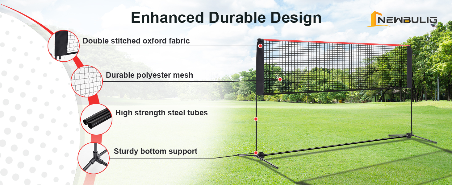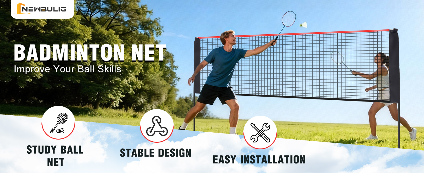 Elevate your outdoor and indoor fun with the NEWBULIG Portable Badminton Net. This versatile multi-sport net is perfect for badminton sets, pickleball net, tennis, soccer tennis net, and kids volleyball net. With adjustable height and multiple width options, it adapts to all your needs, offering endless entertainment for family and friends. It's the ultimate portable outdoor solution for active play, from backyard games to beach days or an indoor badminton set. Crafted for lasting performance, the NEWBULIG badminton net features robust construction with a strong nylon mesh and rust-resistant, powder-coated steel poles. Designed to withstand vigorous indoor volleyball net games or outdoor elements, this reliable badminton net for backyard use ensures exceptional stability and durability for years of enjoyment. Experience ultimate convenience with our highly portable design. This lightweight, foldable NEWBULIG portable tennis net fits perfectly into the included durable carry bag. Easily transport your pickleball net portable, mini volleyball net, or bad mittens set with net to any location – from your backyard to the park, or even a pickle ball net for driveway setup. Setting up your NEWBULIG badminton net portable is incredibly simple, taking less than 3 minutes without tools or ground stakes. Poles are connected by elastic cords, ensuring no loose parts and hassle-free assembly. Quickly adjust the height to transform it from a small volleyball net to an indoor volleyball net, ready for immediate action and endless fun with badminton birdies or shuttlecock.