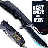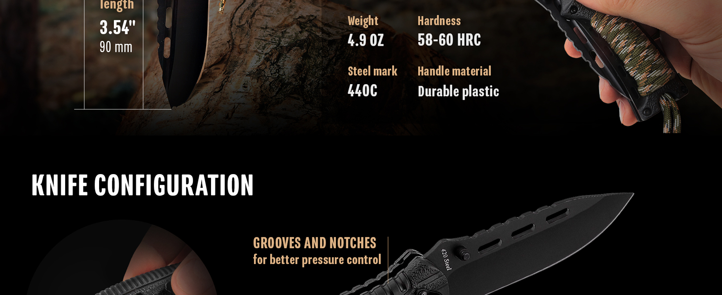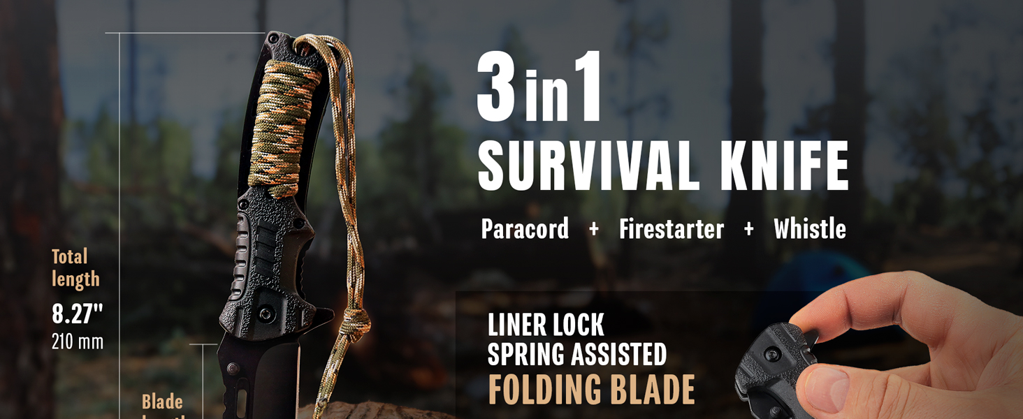 مجموعة سكاكين النجاة: سكين قابل للطي بشفرة حادة وقضيب إشعال النار وصفارة. المقبض ملفوف بحبل باراكورد من أجل قبضة آمنة ووظيفة إضافية للبقاء عند الحاجة. يتضمن مشبك للجيب؛ فهو يوفر حملًا يوميًا آمنًا ومريحًا.