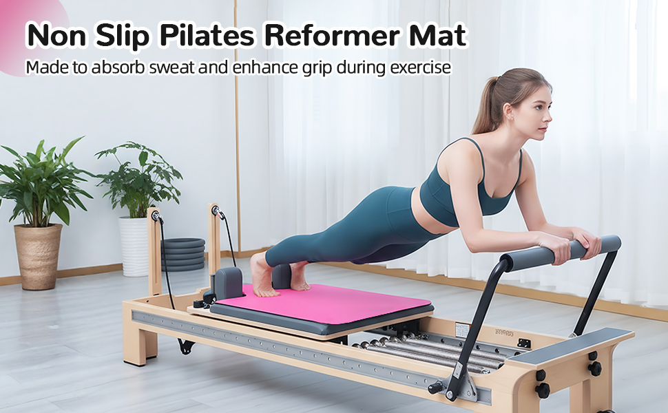 مواد فاخرة: تتميز الطبقة السطحية لحصيرة البيلاتيس بقماش سويدي ناعم صديق للبشرة يمتص العرق لتعزيز الراحة. يشتمل الجانب العكسي لإكسسوارات البيلاتس على نسيج حبيبي غير قابل للانزلاق، مما يوفر قبضة فائقة لمنع الانزلاق بشكل فعال على طول قضبان المعدات