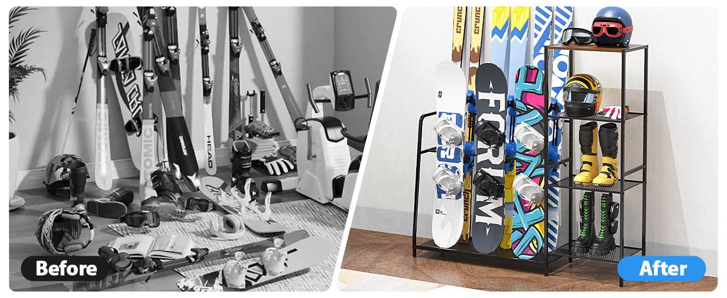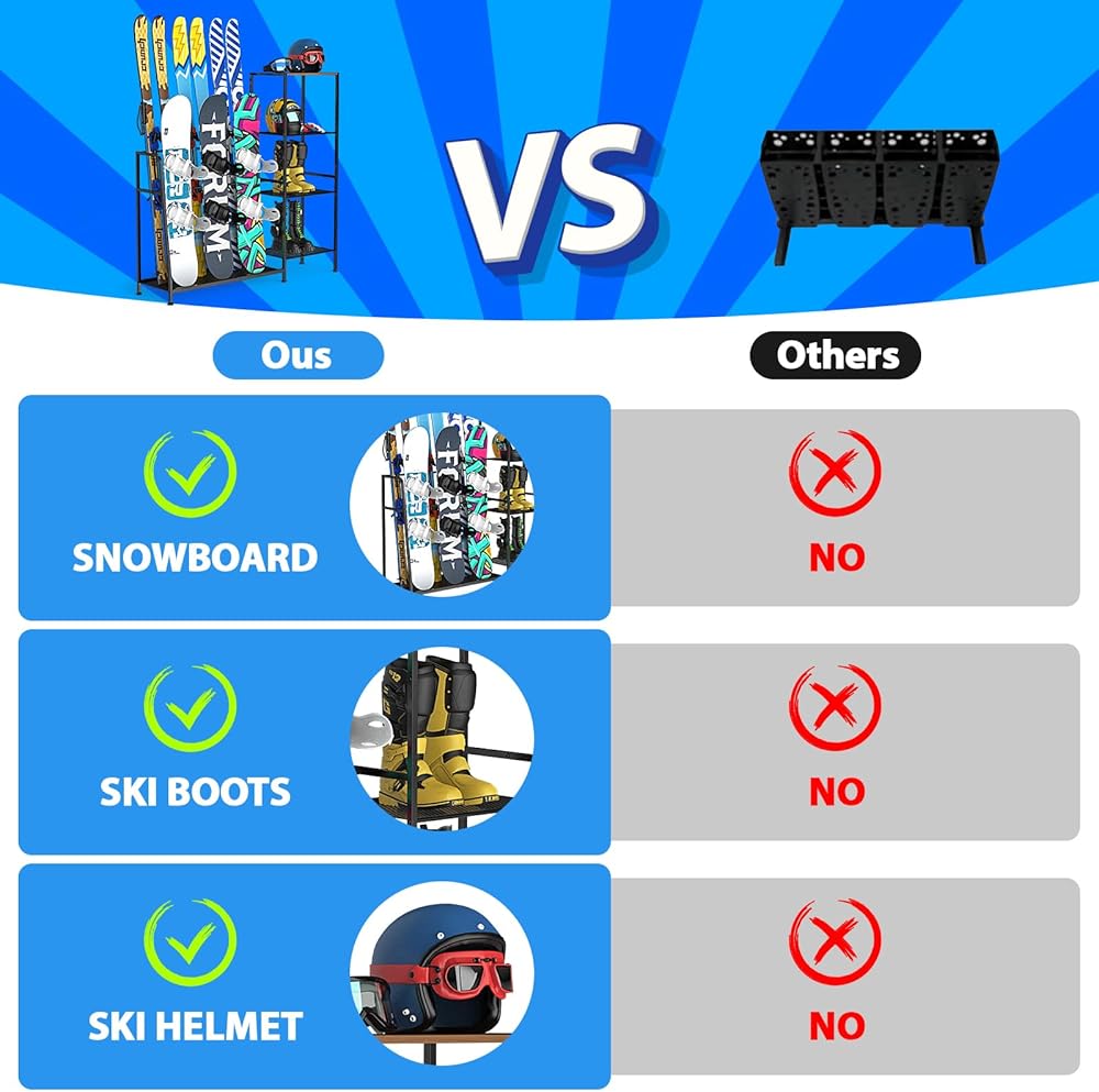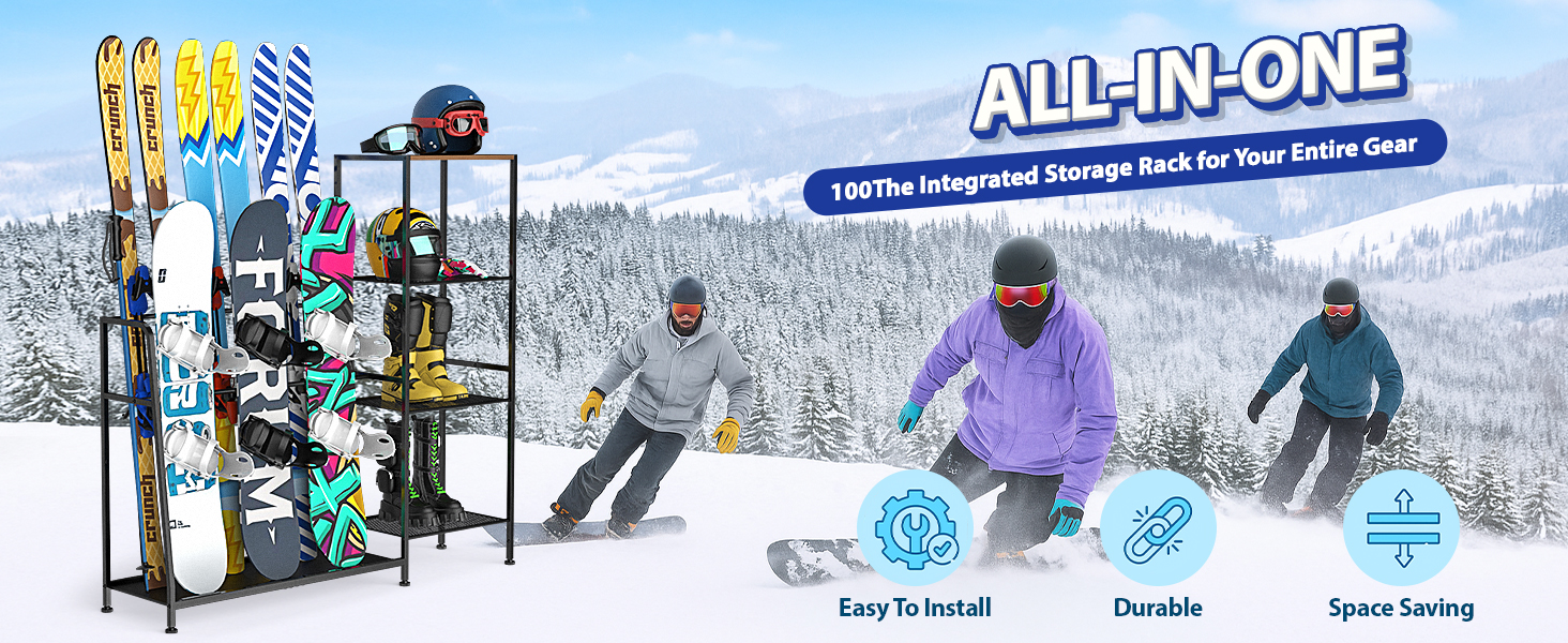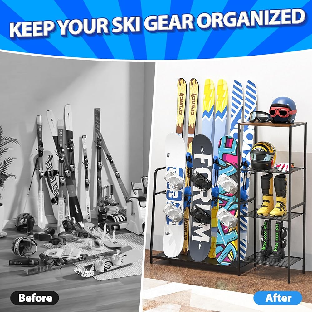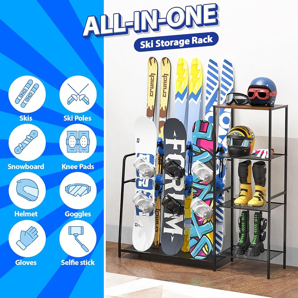 حل تخزين الكل في واحد: يمكنك بسهولة تنظيم 4 مجموعات من الزلاجات والأعمدة، و3 ألواح تزلج، وأحذية طويلة، وخوذات، ونظارات واقية، ونظارات شمسية، ومنصات الركبة، والمناشف، والقفازات، والشمع، وأجهزة تدفئة الأيدي، وعصي السيلفي، وجميع معدات التزلج الخاصة بك تقريبًا في رف واحد أنيق.