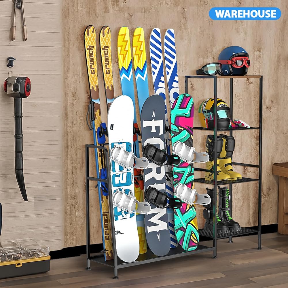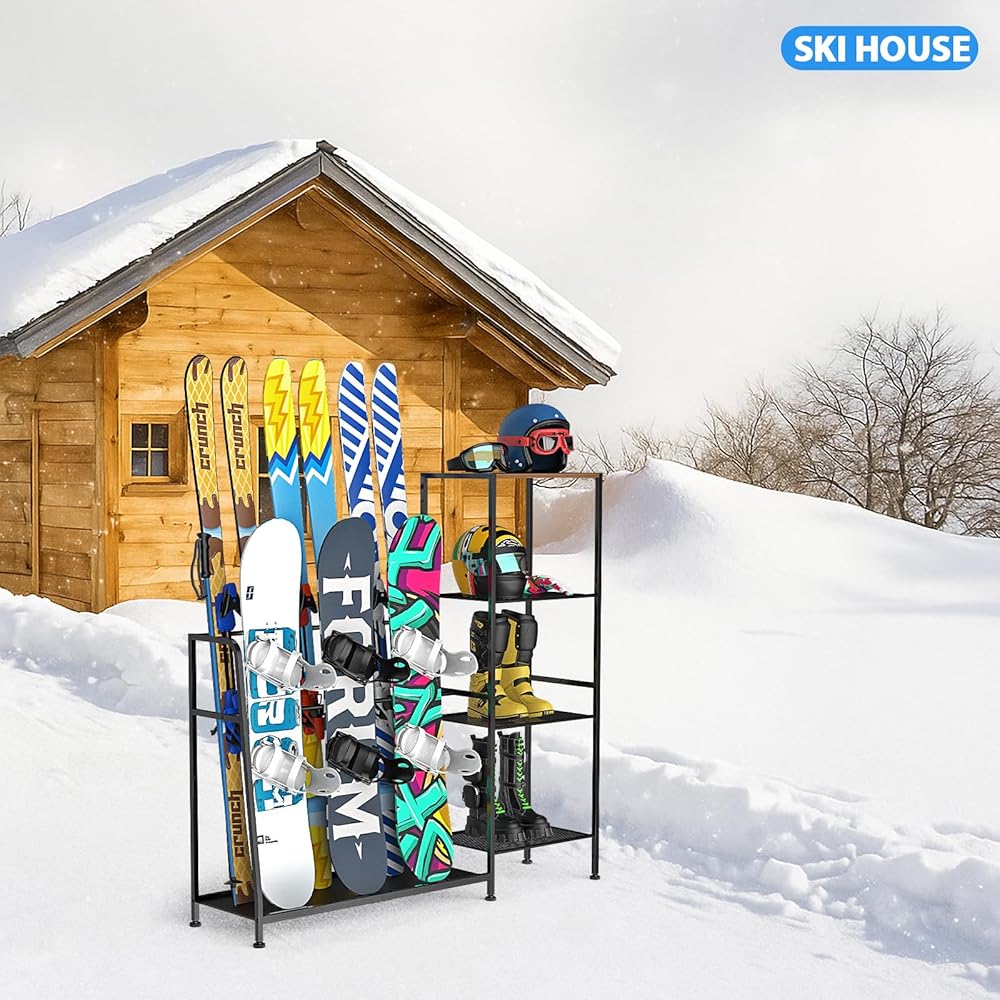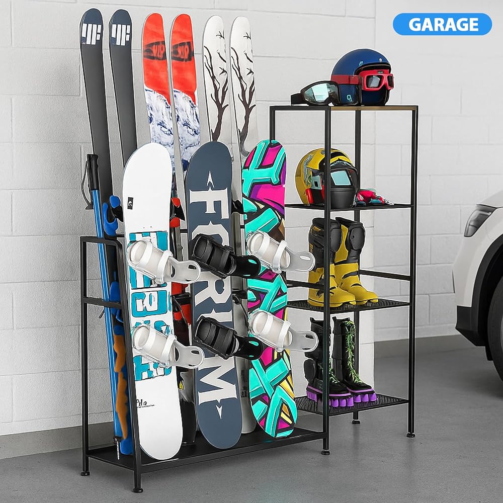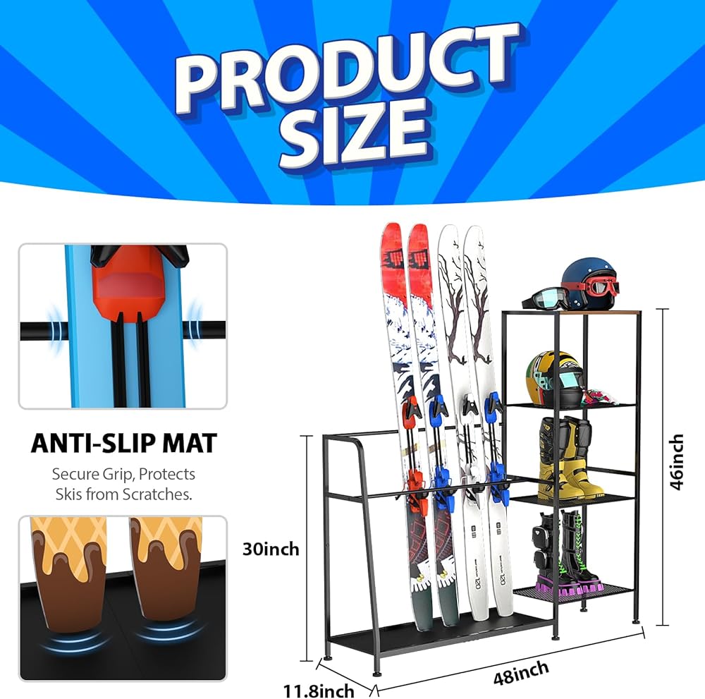 حامل ألواح التزلج قائم بذاته - حاملات تزلج لأربعة أزواج من الزلاجات، 3 قطع من ألواح التزلج، حذاء طويل، عمود، نظارات واقية، خوذة وأكثر من ذلك، منظم تزلج بحامل أرضي من الفولاذ عالي التحمل للمرآب والسقيفة والطابق السفلي