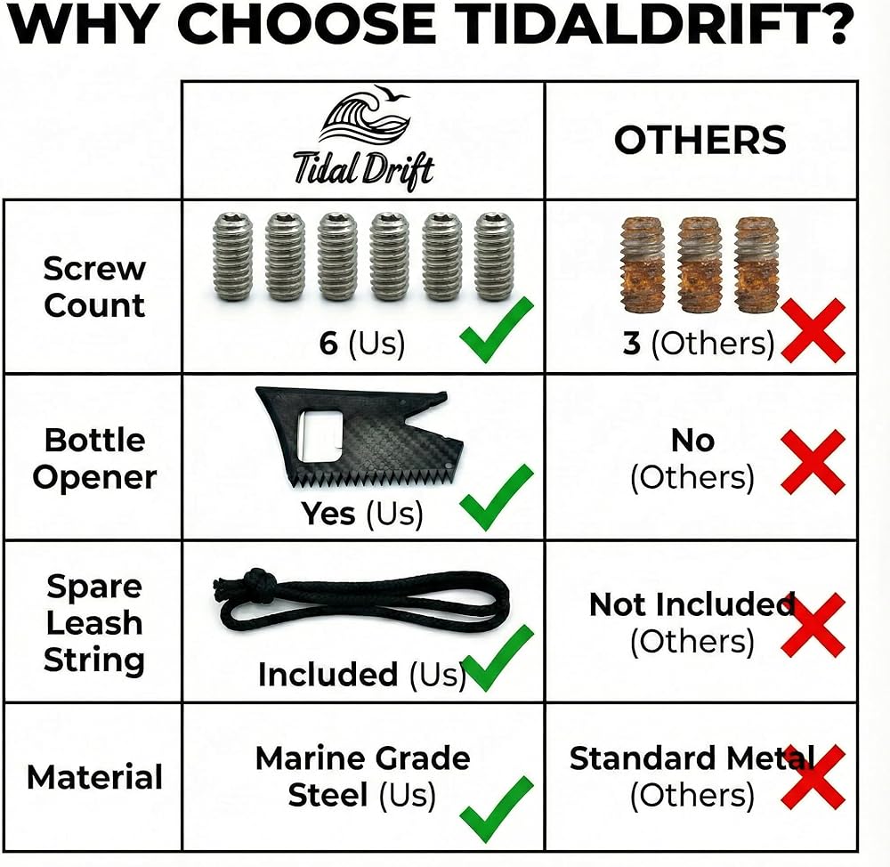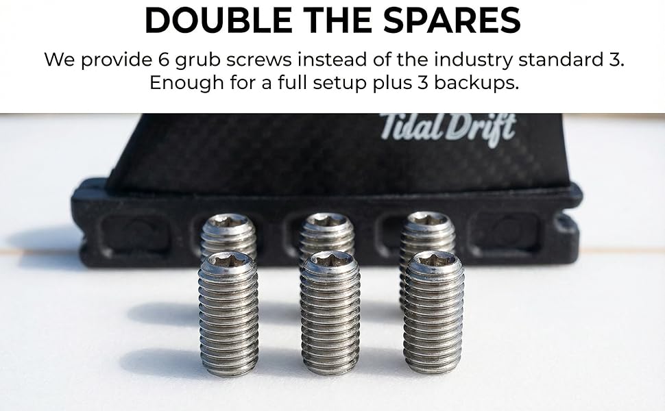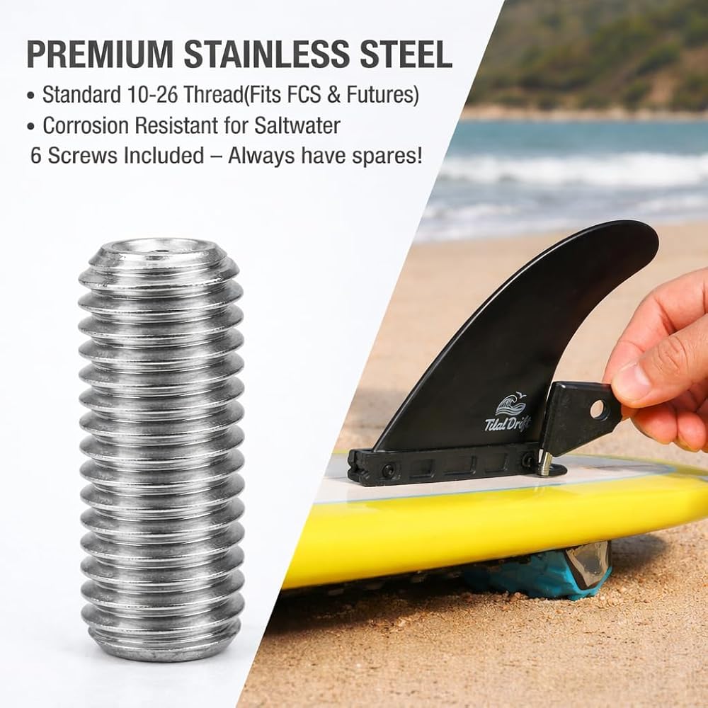 【مسامير من الفولاذ المقاوم للصدأ من الدرجة البحرية 】 تتضمن 6 براغي من الفولاذ المقاوم للصدأ من الدرجة البحرية 304 (خيط قياسي 10-24) متوافقة مع معظم صناديق الزعانف FCS وFutures. يضمن توفير 6 براغي حصولك على نسخ احتياطية للوحات القصيرة أو الطويلة أو SUPs