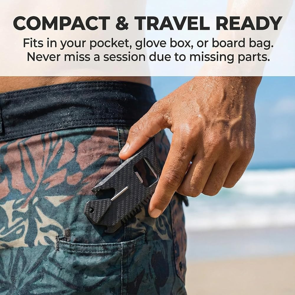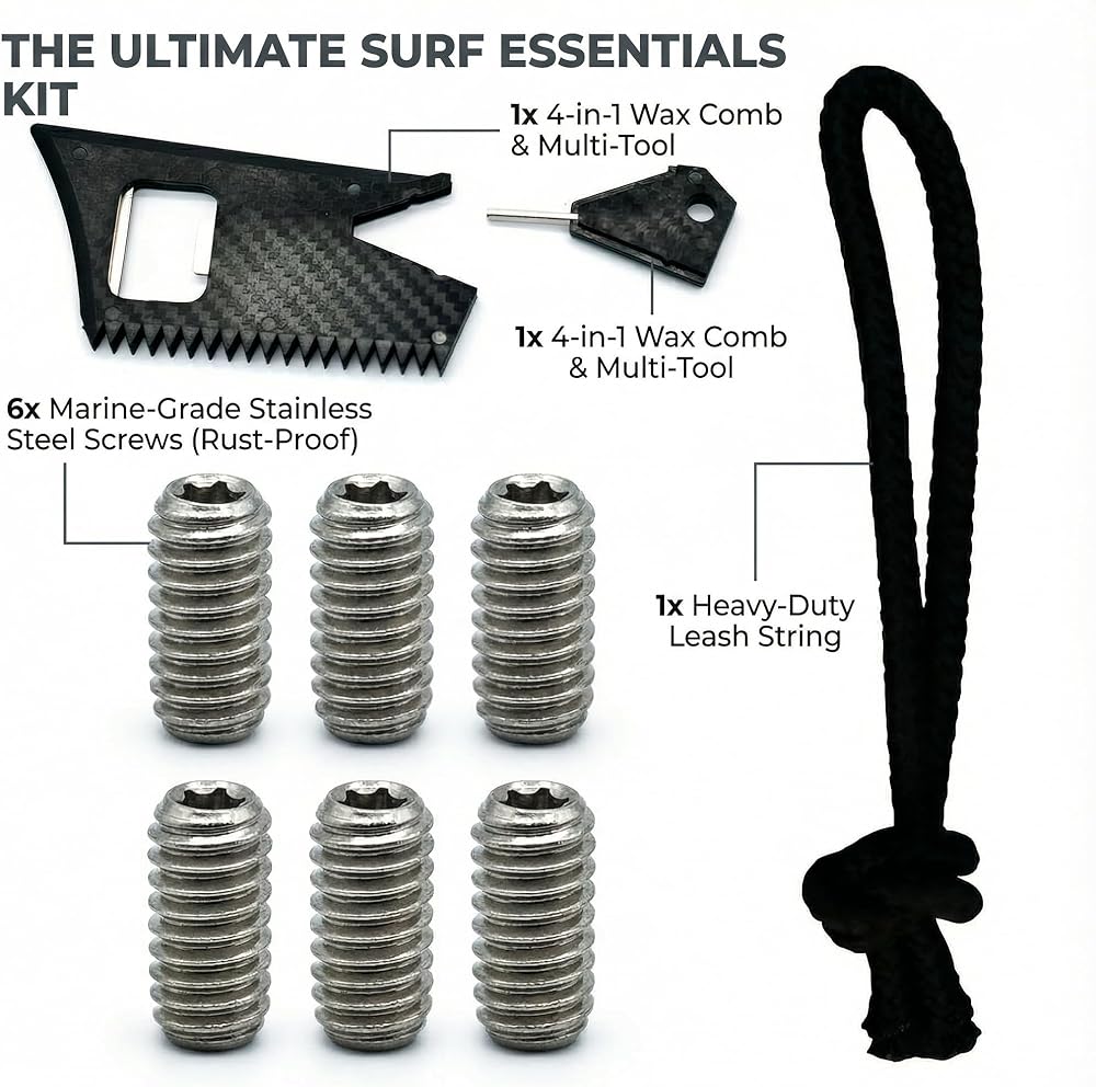 【مجموعة صيانة ركوب الأمواج الكل في واحد 🏄】 احصل على مجموعة صيانة ألواح ركوب الأمواج الكاملة المصممة للاستعداد. تحتوي هذه الحزمة على 6 براغي زعانف من الفولاذ المقاوم للصدأ، ومشط شمع 4 في 1، وسلسلة مقود شديدة التحمل. احتفظ بها في حقيبة ركوب الأمواج الخاصة بك للتأكد من أنك جاهز دائمًا لجلستك
