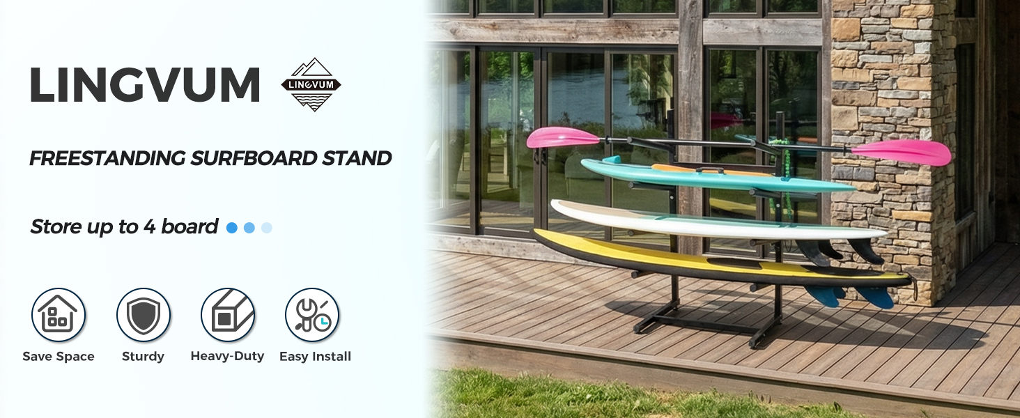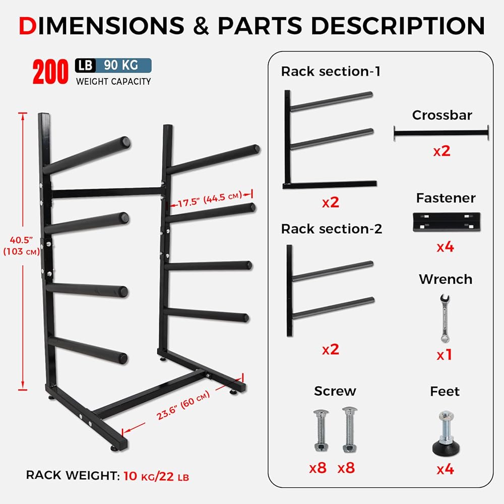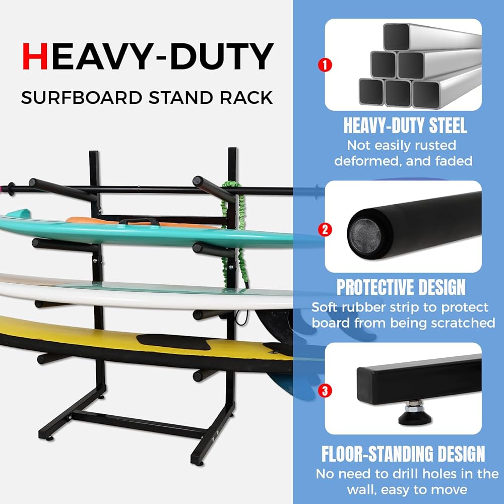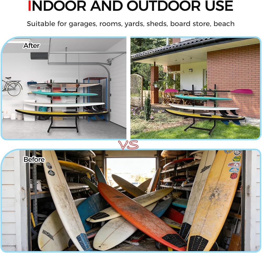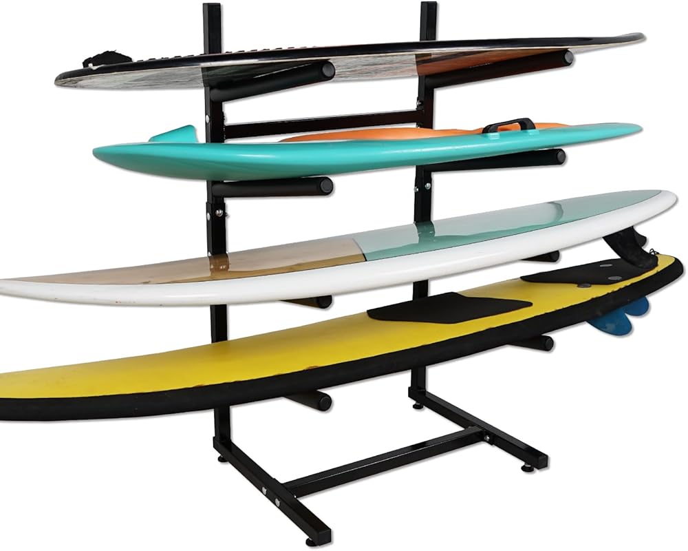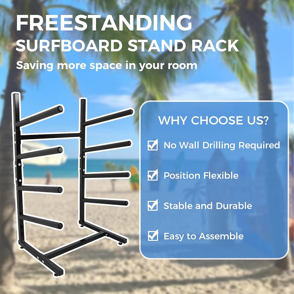 رف تخزين لوح التزلج القائم بذاته --- لا يحتاج رف لوح ركوب الأمواج هذا إلى حفر ثقوب في الحائط، لتجنب تلف منزلك. تصميم قائم بذاته وثابت على الأرض يجعل من السهل تحريكه ويمكن وضعه في أي مكان تريده. مثالية للجراجات والغرف ومتجر التجديف