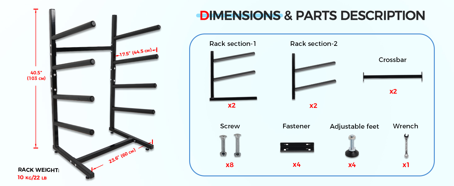 سهل التركيب --- تصميم حامل لوح التزلج الرأسي الخاص بنا بسيط، فقط يحتاج إلى مفتاح ربط صغير (متضمن)، ويمكن إكمال التجميع والتفكيك بسهولة. الوزن 22 رطل (10 كجم)
