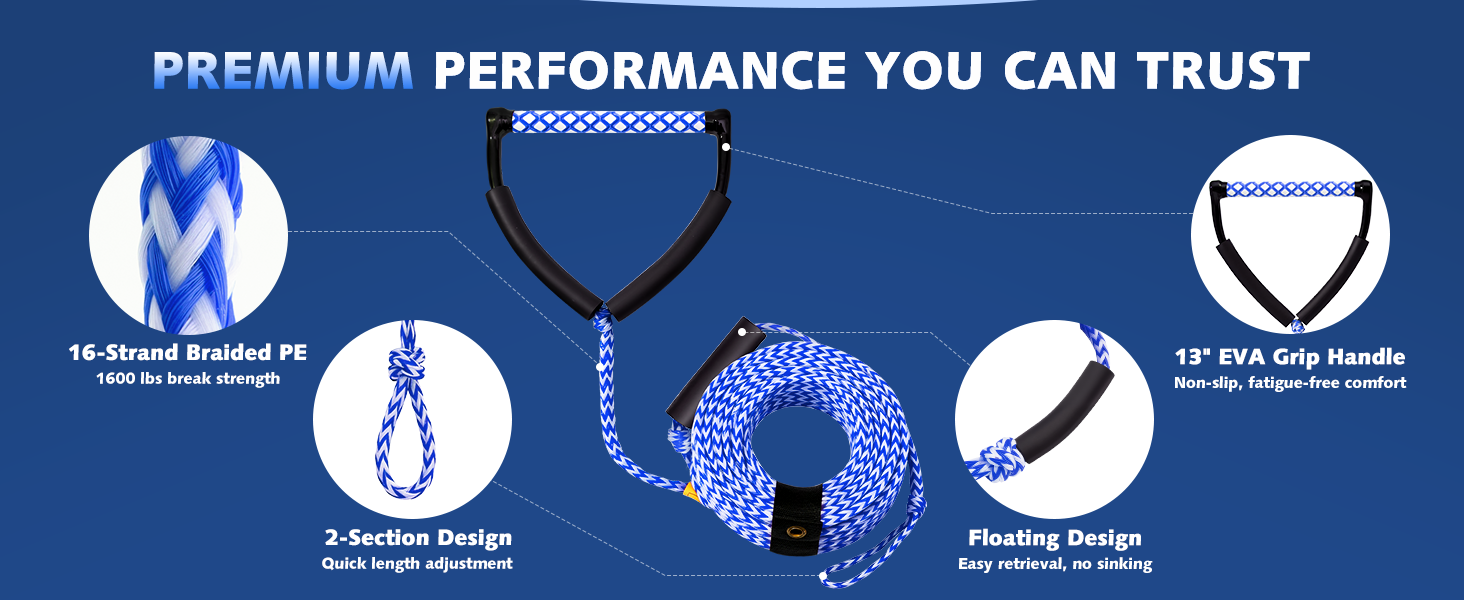 The 16-strand braided construction boasts an impressive 1600 lbs tensile strength, providing explosive acceleration. Paired with a full 13-inch EVA handle, this water ski rope floating handle delivers exceptional comfort and control.