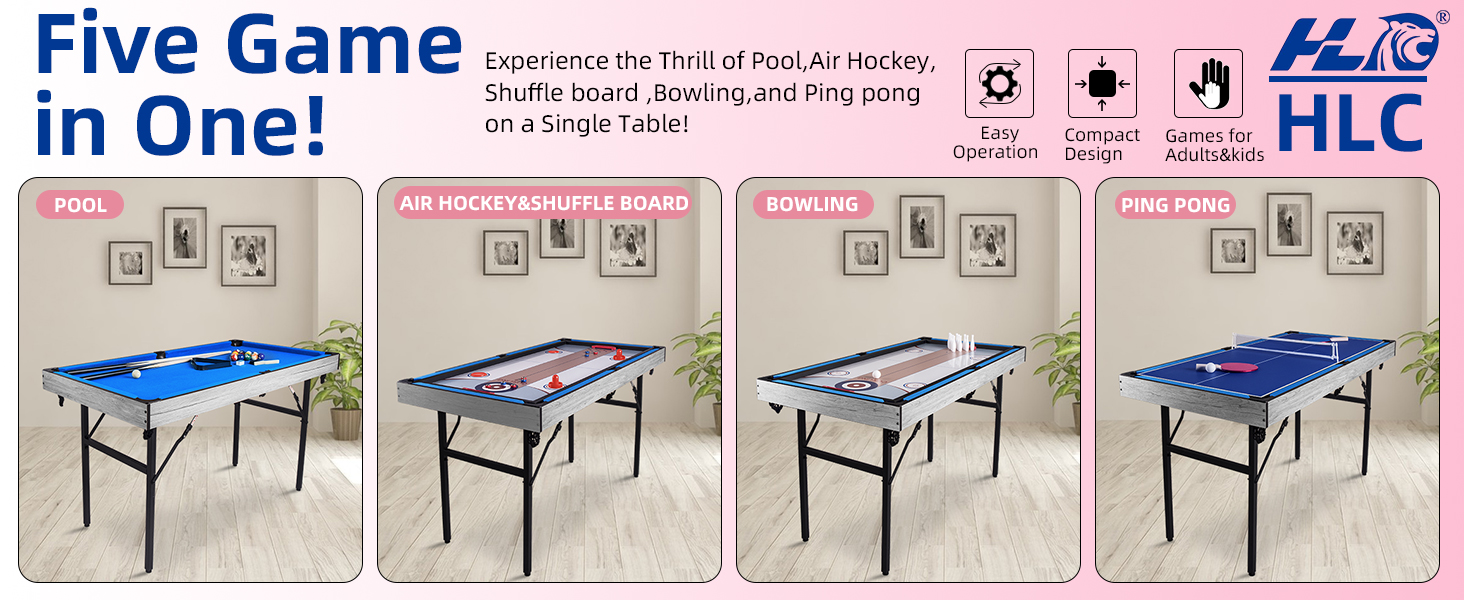 طاولة ألعاب متعددة الوظائف 5 في 1، مجموعة طاولة متعددة الألعاب قابلة للطي مع بينج بونج، بلياردو حمام السباحة، هوكي الهواء، البولينج، ولعبة الشفلبورد للداخل والخارج