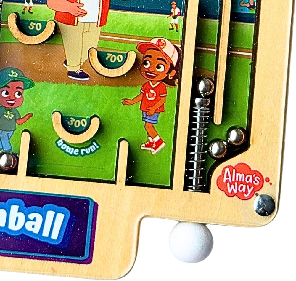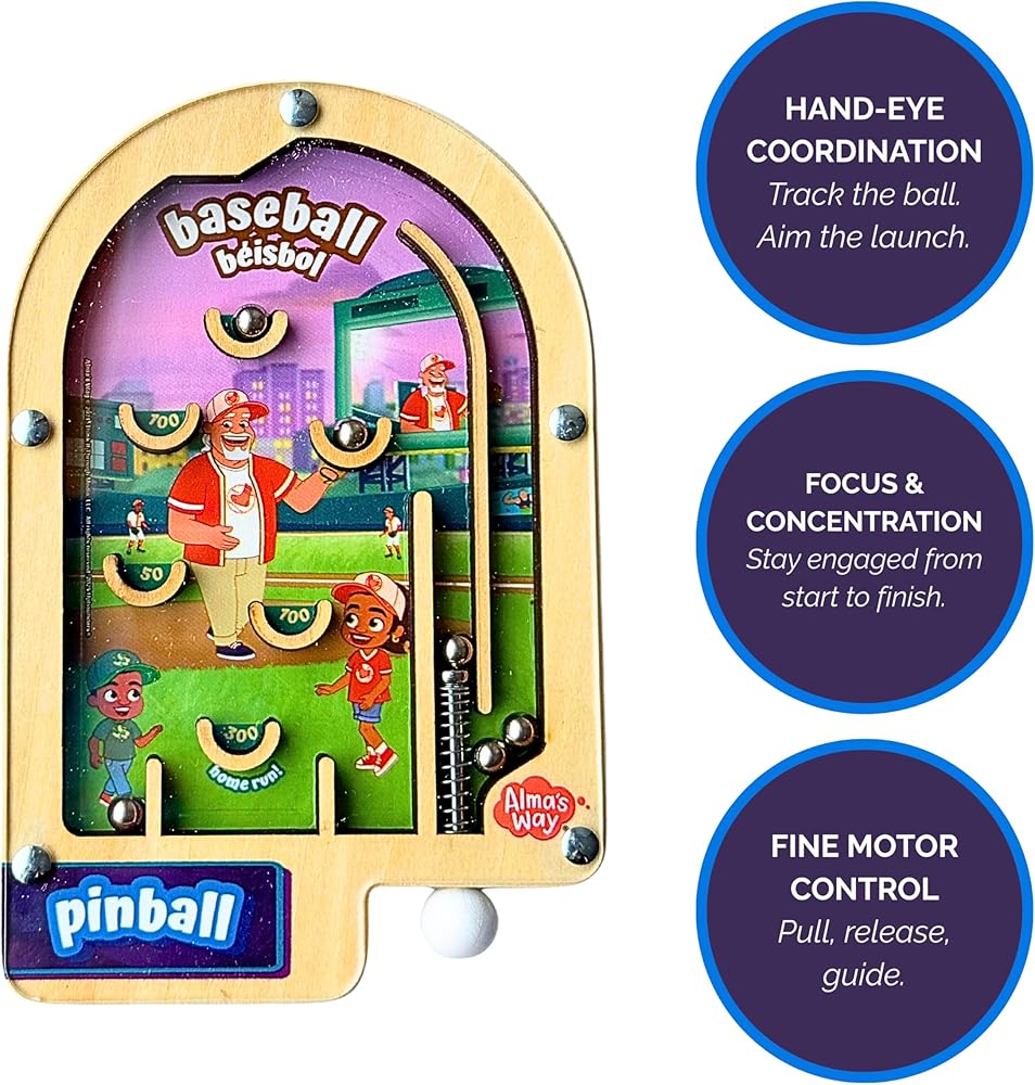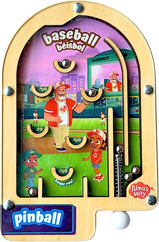 Step up to the plate with Upbounders Alma's Way Baseball-Béisbol Wooden Pinball, a delightful blend of classic pinball action and baseball excitement! This hand-held wooden travel game brings the thrill of America's favorite pastime to life in a compact, portable format perfect for kids ages 3 and up. The bilingual design features both English and Spanish text, making it an engaging learning tool while providing hours of entertainment. Players can practice their pinball skills by launching the ball and watching it bounce through the baseball-themed obstacles. Its wooden construction offers durability for long-lasting play, while the travel-friendly size makes it ideal for road trips, waiting rooms, or anywhere your little slugger wants to play. The perfect combination of skill-building and fun, this pinball game helps develop hand-eye coordination and fine motor skills through engaging play. Take this unique sports-themed pinball game anywhere and everywhere - no batteries required!
