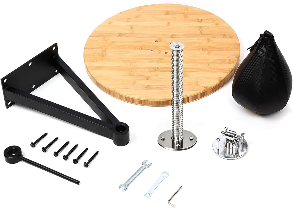 Package Includes: 1 wall-mount frame, 1 Bamboo wood platform, 1 Speed bag bearing swivel, 1 speed bag(10‘'x7"), 1 Hand pump with Air needle, Screws