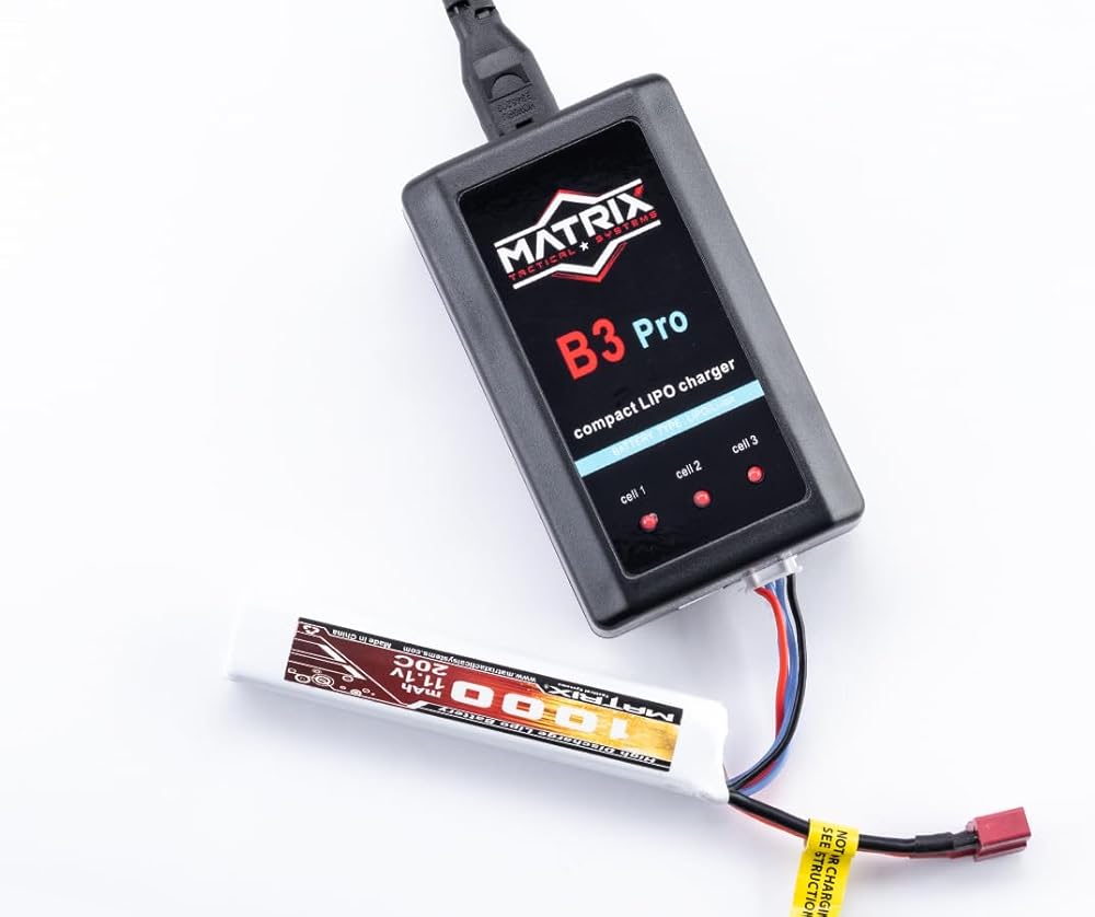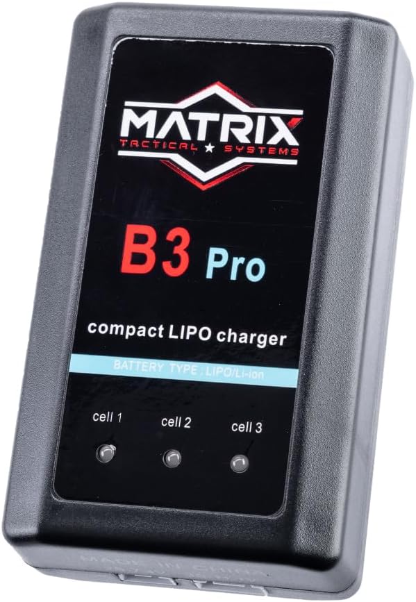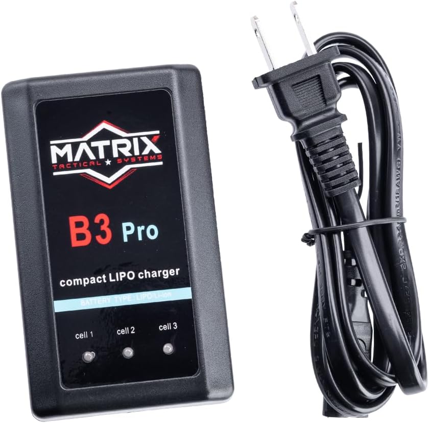 Keep your LiPo and Li-Ion batteries charged safely with the Matrix B3 Pro Compact Smart Charger. Designed for 1-3 cell (7.4V-11.1V) batteries, it balance-charges automatically and shuts off at full charge to help protect battery life. LED indicators show charging status at a glance, making it a simple, dependable option for Airsoft and RC use.