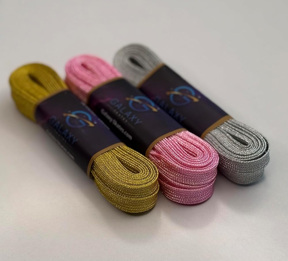 Add shimmer and shine to every stride with Galaxy Skates Metallic Laces—the perfect way to give your roller skates, boots, or high-top sneakers a glamorous upgrade. Available in dazzling Pink, radiant Gold, and sleek Silver, these sparkly laces catch the light with every move, making them a standout accessory for the roller rink, outdoor skating trails, or city streets. Offered in three versatile lengths—51", 96", and 108"—these laces are designed to fit most roller skates, roller derby skates, ice skates, and high-top sneakers, giving you the ideal size for a secure fit and creative lacing styles. Made with a strong woven construction and metallic threading, they're both beautiful and durable, holding tight through spins, jumps, and long skate sessions without slipping or fraying. Whether you're looking to match your skates, complement your outfit, or make a bold style statement, Galaxy Skates Metallic Laces deliver the perfect mix of performance, durability, and eye-catching sparkle. Perfect for skaters who want to roll in style and shine bright wherever they go.