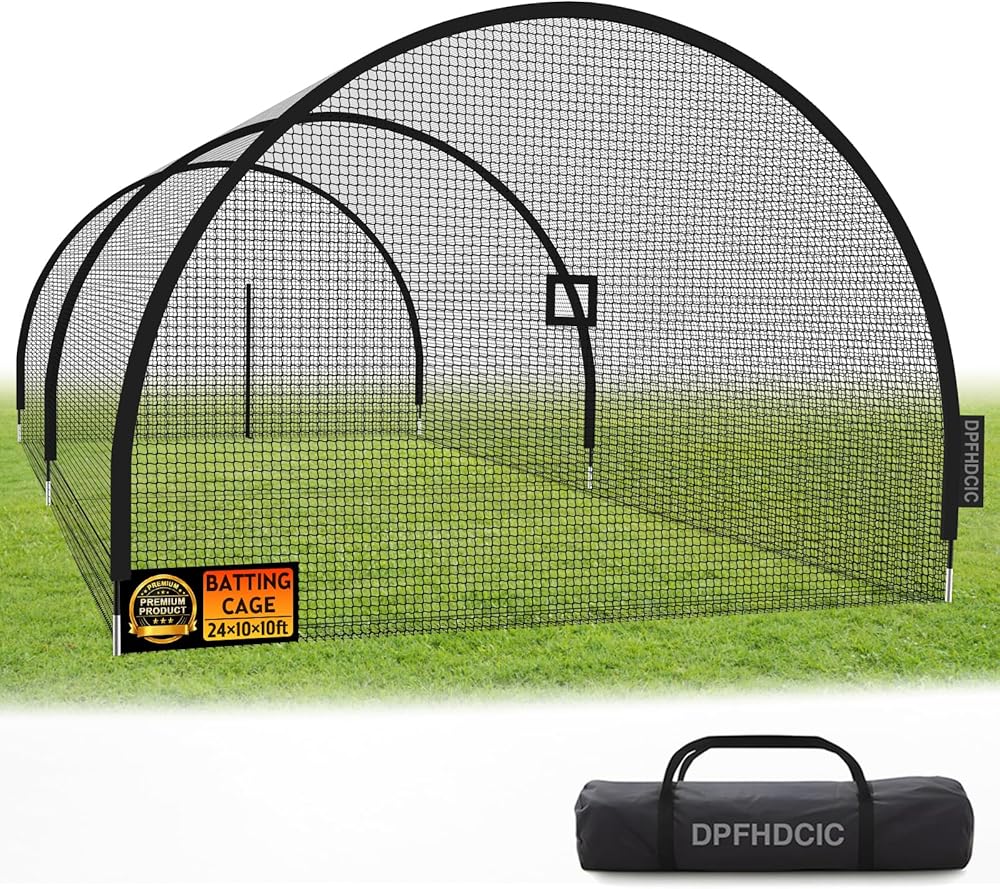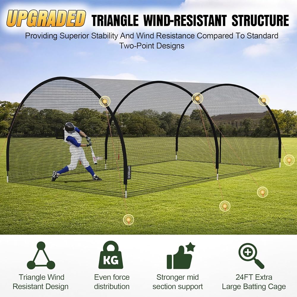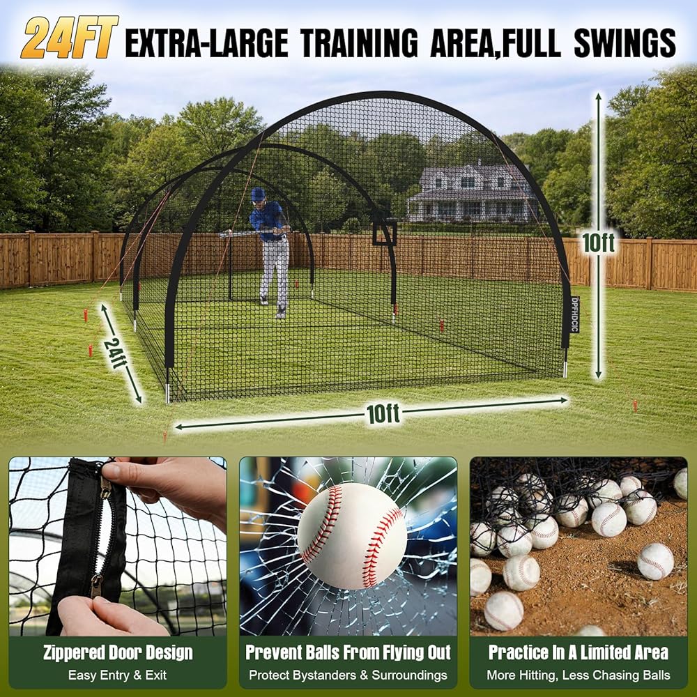 Extra-Long 24ft Batting Cage: With a 24ft extended length, this hitting cage offers more space for hitting and pitching. The durable 4-ply polyester batting cage netting absorbs impactand helps minimize rebound. Ideal for intensive training