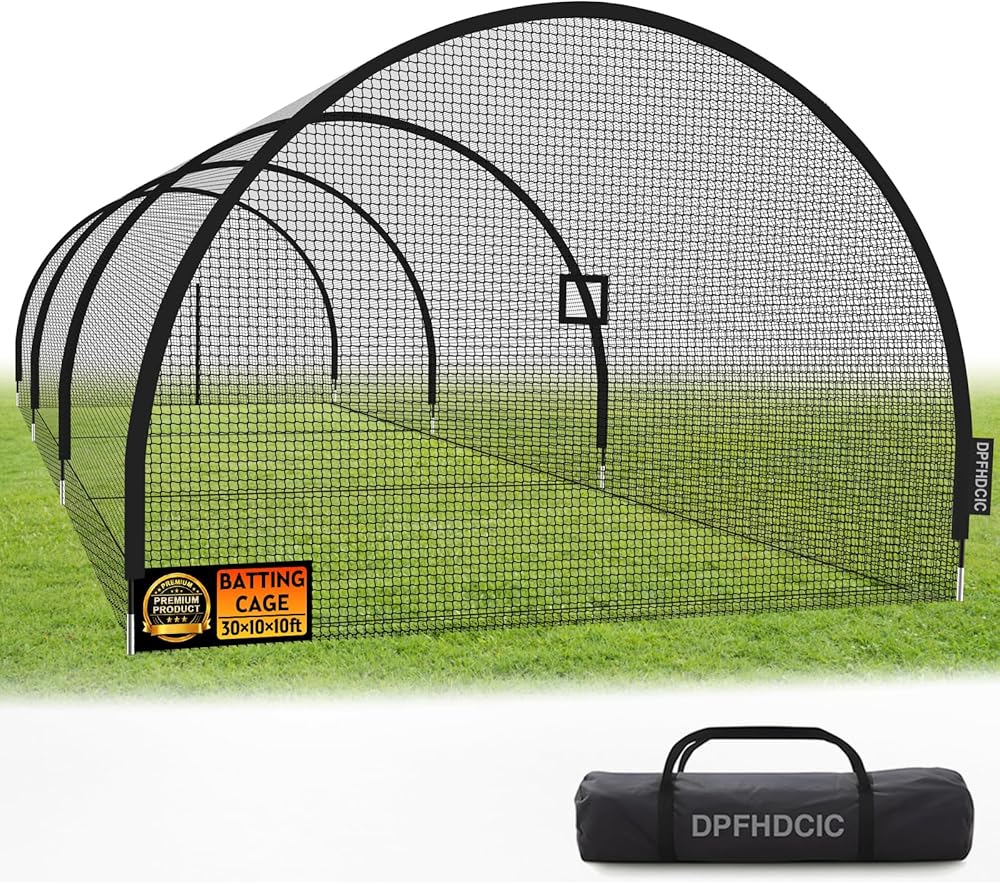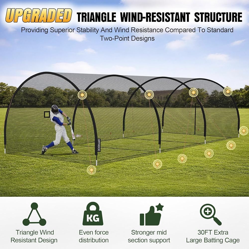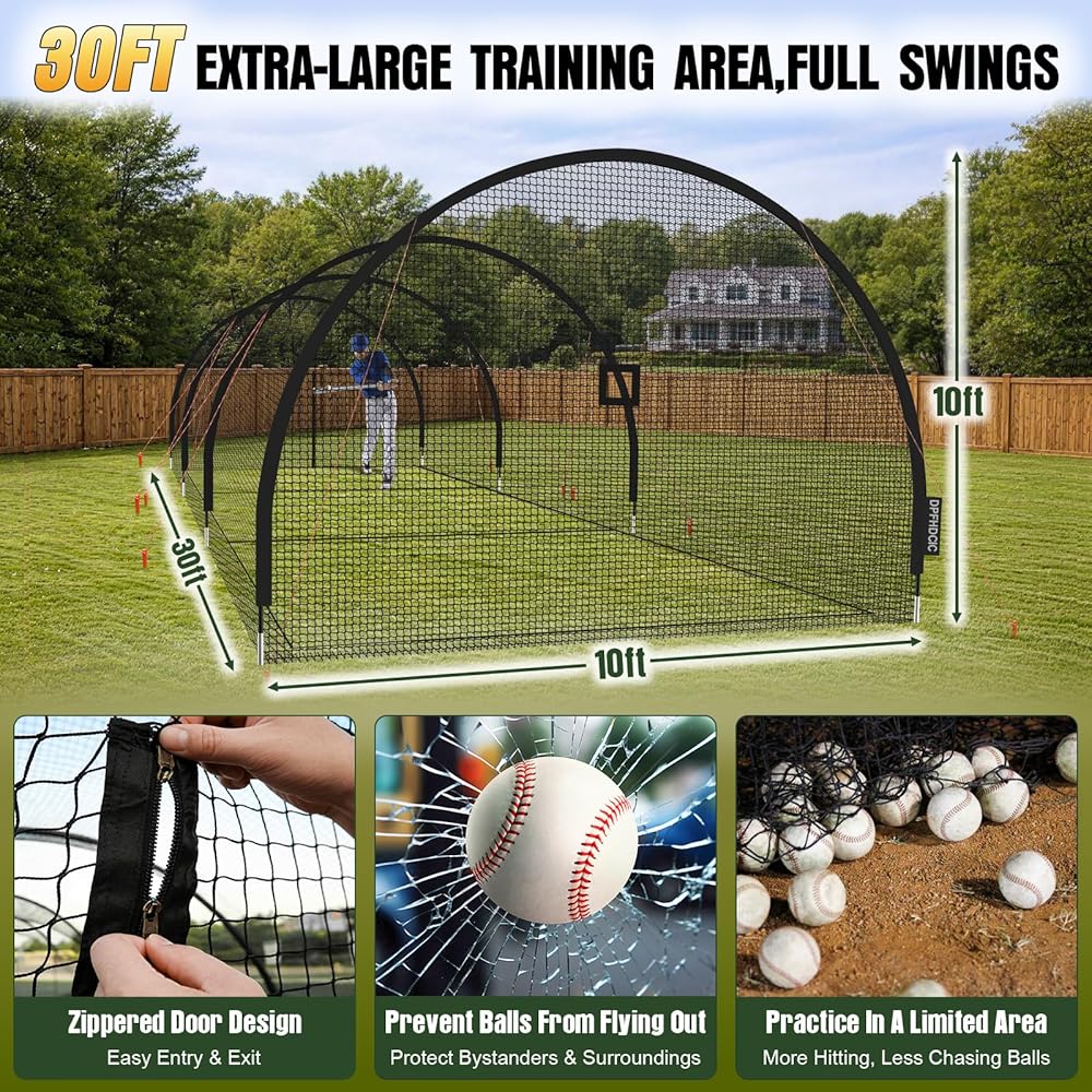 Extra-Long 30ft Batting Cage: With a 30ft extended length, this hitting cage offers more space for hitting and pitching. The durable 4-ply polyester batting cage netting absorbs impact, reduces rebound. Perfect for heavy-duty training