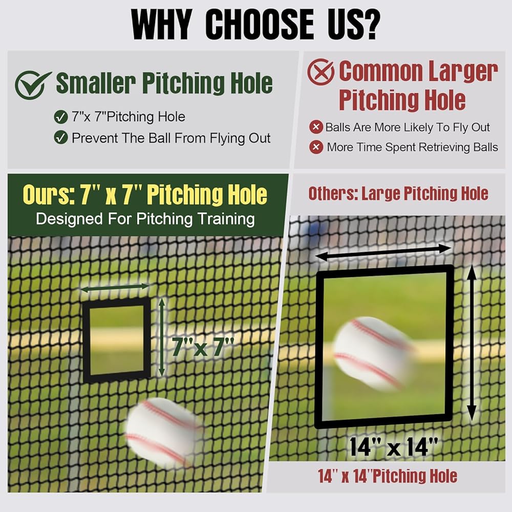 Zipper Door & Built-In Pitching Hole: Featuring a 5.2 ft tall zipper door for quick, secure entry. The integrated 7"×7" pitching port, built for pitching net batting cage training, this precisely sized pitching machine hole works seamlessly with pitching machines or hand throws, this design keeps balls safely inside the batting cages