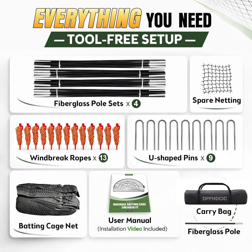 Complete Accessory Kit: Batting Cage Net × 1, Fiberglass Pole Sets × 4, Extra Fiberglass Pole × 1, Ground Stakes × 13, Wind Ropes × 13, U-Shaped Pins × 9, Repair Net Patch × 1, Carry Bag × 1, and User Manual × 1. Tool-free setup means you can start training right away