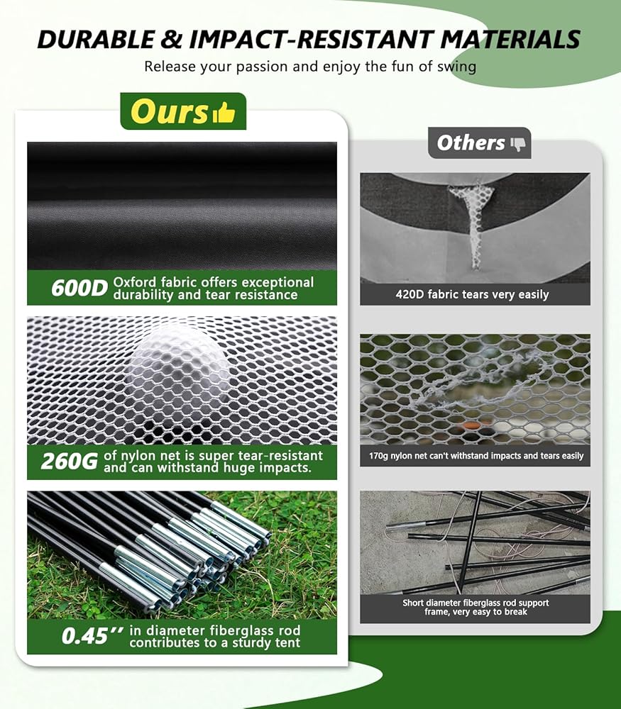 【🏌شبكة جولف متينة وعالية الجودة】شبكة تدريب الجولف هذه مصنوعة من قماش أكسفورد 600D عالي الجودة وشبكة نايلون ممتصة للصدمات 260 جرام، ومتانة معززة ومقاومة للتمزق يمكنها تحمل التأثيرات الثقيلة والاستخدام طويل الأمد. إطار من الألياف الزجاجية المتين بقطر 0.45 سم لتأمين الشبكة، مثل الخيمة، مما يسمح لها بالوقوف بثبات على الأرض