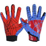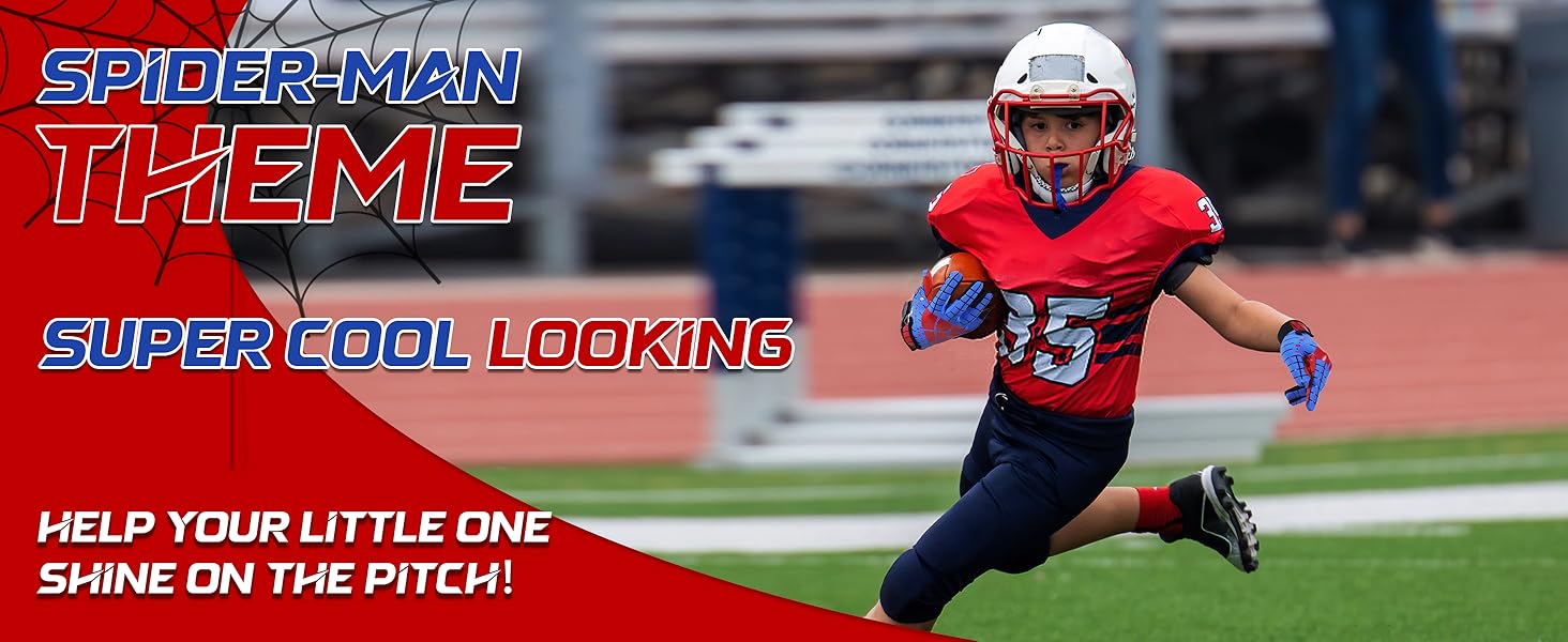 Kids Receiver Football Gloves with Distinctive Design:These football gloves feature a vibrant and bold super hero color scheme that will make you stand out from the crowd. With intricate details reflecting the hero's suit,making them perfect for players who want to channel their inner super hero on the field.