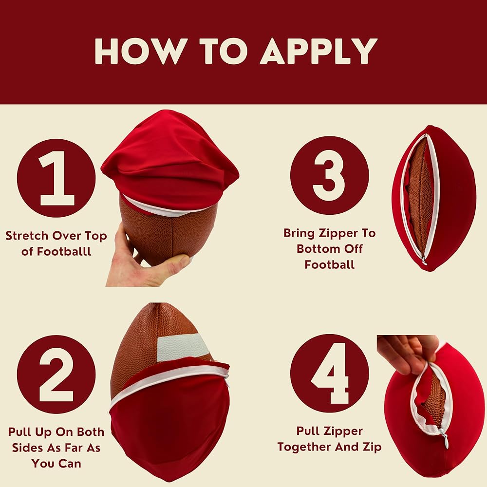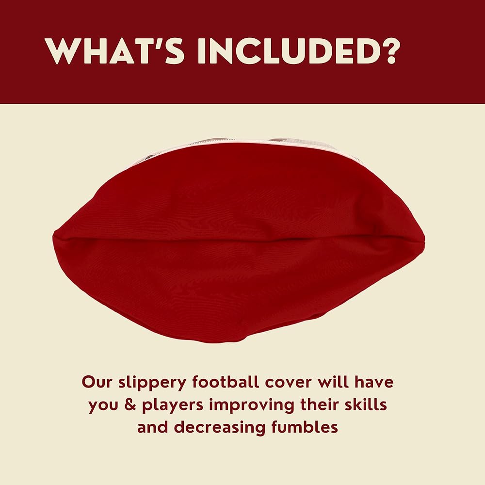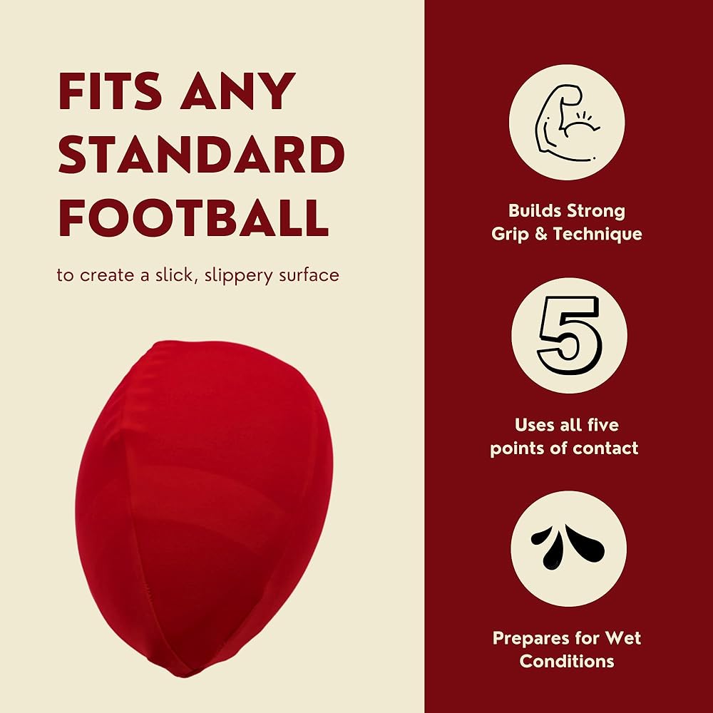 Slip-on football cover simulates a slick, wet ball surface for training. Creates a challenge to grip, forcing players to tighten their hold and use proper technique. Encourages using all five points of contact to secure the ball – fingers, palm, forearm, elbow, and chest. Builds strong ball-handling habits by practicing with a consistently slippery ball. Perfect for quarterbacks and running backs to practice smooth hand-off exchanges under tough conditions. Great for ball carriers to work on covering up and protecting the ball securely while running. Ideal for receivers to practice the “catch-and-tuck” technique — catching the ball and quickly tucking it away. Helps kickoff and punt returners improve their fingertip catch skills with a slick ball. Features an interior strap that lets you peel back one side of the cover, so you can still throw the ball during drills. Made of durable, stretchy Lycra fabric for a snug fit and long-lasting use