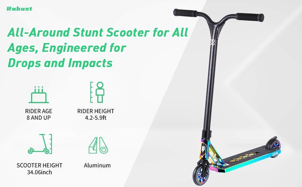 Professional Support, Quality Guaranteed:Built for riders. The Robust scooter is made for intermediate and advanced riders aged 8 and up. Lightweight, strong, and capable of supporting up to 220 lbs (100 kg), it's perfect for teens and adults who ride hard. With a 6-month warranty, 30-day money-back guarantee, and friendly customer support, you can ride with confidence.