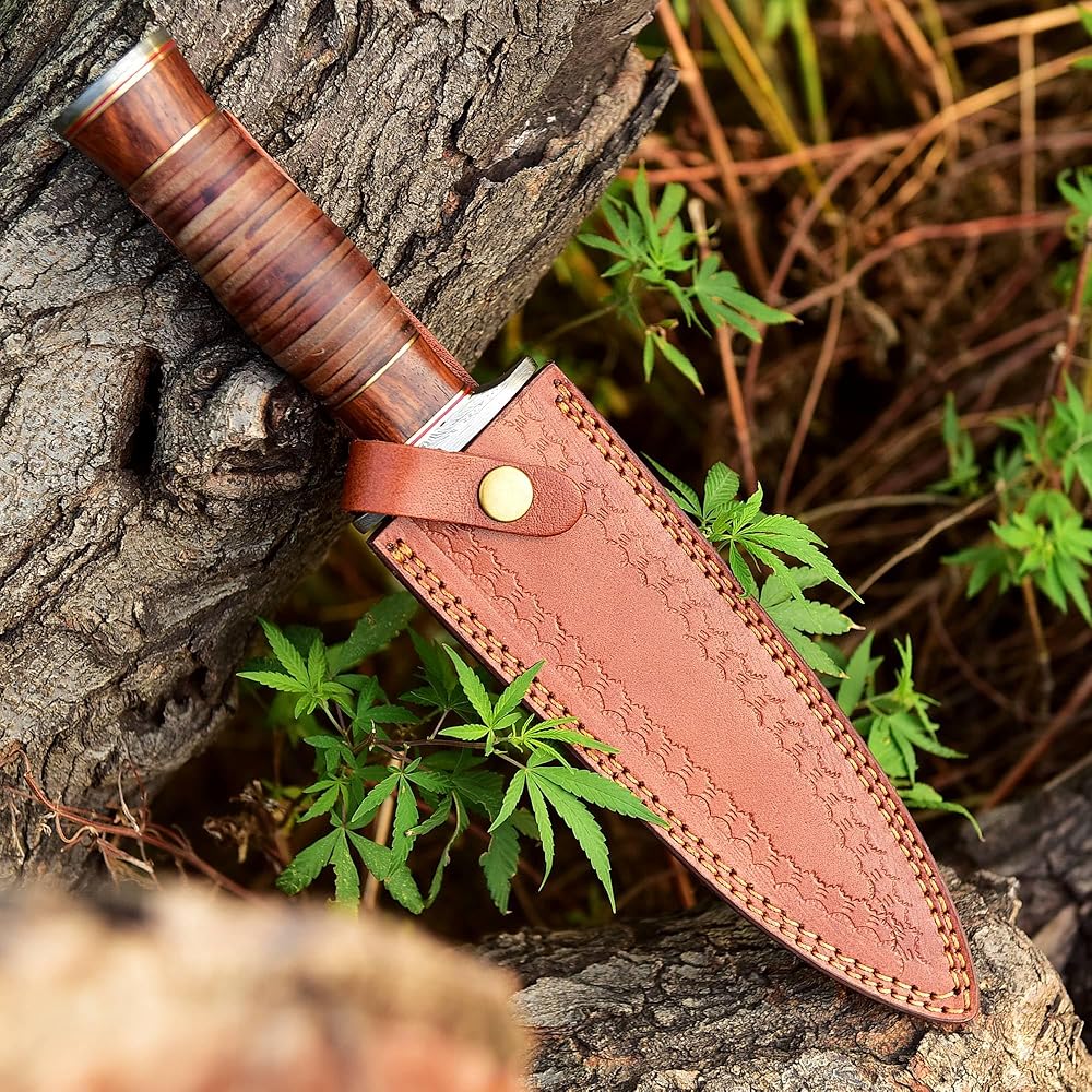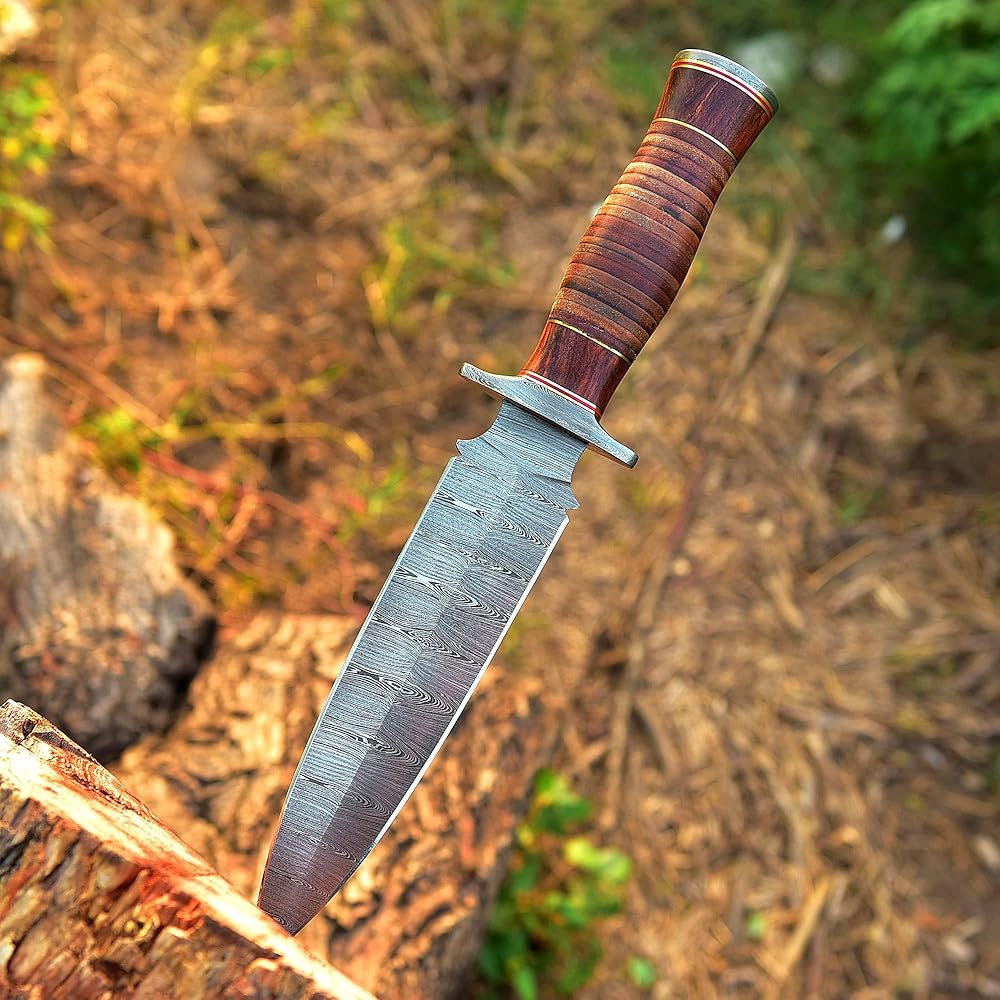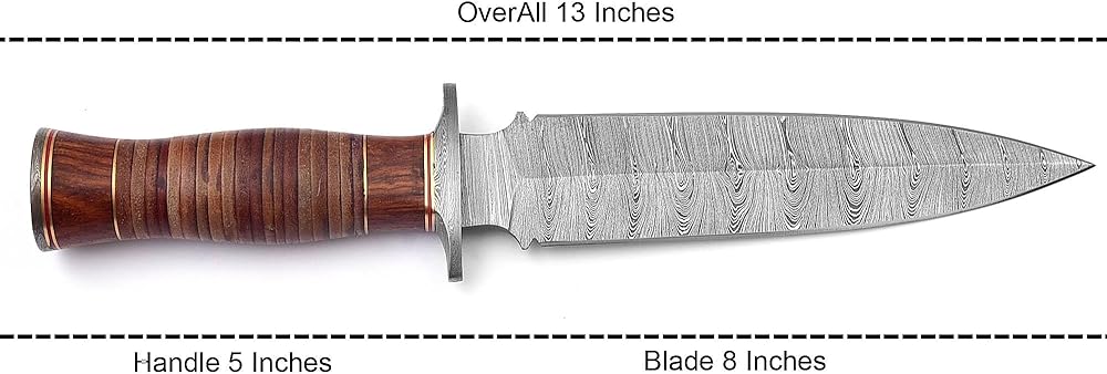 Damascus Dagger Knife is Simple, Stylish & Light Weight. handle made of Leather with little addition of Walnut wood at the endings. Guard and Pommel is Damascus Steel. MEASUREMENTS Over All Length = 13.00 Inches,Handle Length = 05.00 Inches, Blade Length = 08.00 inches Knife has Twisted pattern Damascus steel blades. The blade is Made By 1095/15N20 ALLOY STEELS (176 true Layers) Hand forged to Beautiful Pattern. Damascus steel of this knife has high quality contents to give an excellent edge and sharp cutting abilities. Hardness of the blade of this knife is HRC 58-60 in the lab & been hand sharpened to a Sharp Edge. SHEATH :Handmade Durable Leather Sheath