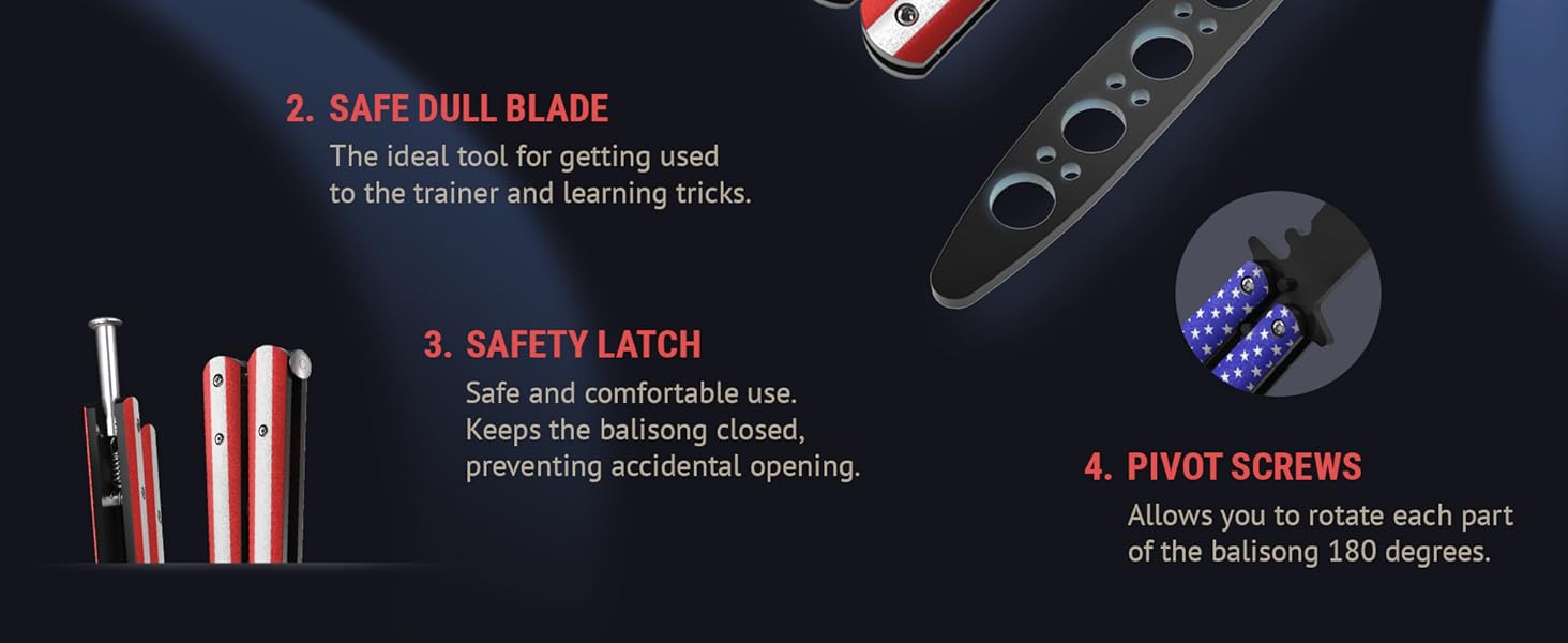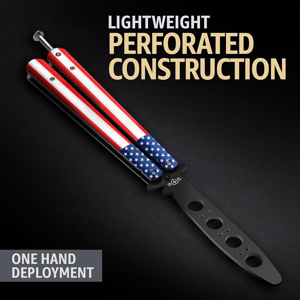 • بناء متين. نحن نستخدم الفولاذ المقاوم للصدأ عالي الجودة مع مسامير معززة ودبابيس ومزلاج زنبركي. تم تصميم سكين الفراشة التدريبي الخاص بنا لتحقيق التوازن الأمثل والمتانة والتعامل والاستخدام الموثوق به خلال جلسات التدريب.