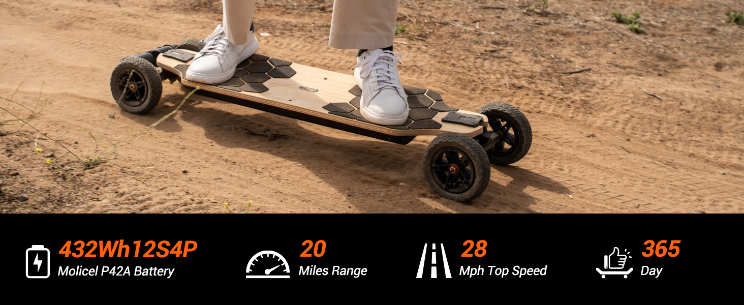 هيكل متين - تم تصميمه ليدوم طويلاً باستخدام سطح مركب من ألياف الكربون + خشب القيقب الكندي مقاس 42 بوصة، مقترنًا بإطارات هوائية للطرق الوعرة مقاس 8 بوصات وشاحنات معززة على طراز الدراجة الجبلية. مصممة لامتصاص الصدمات والحفاظ على التوازن على الأسطح الوعرة.