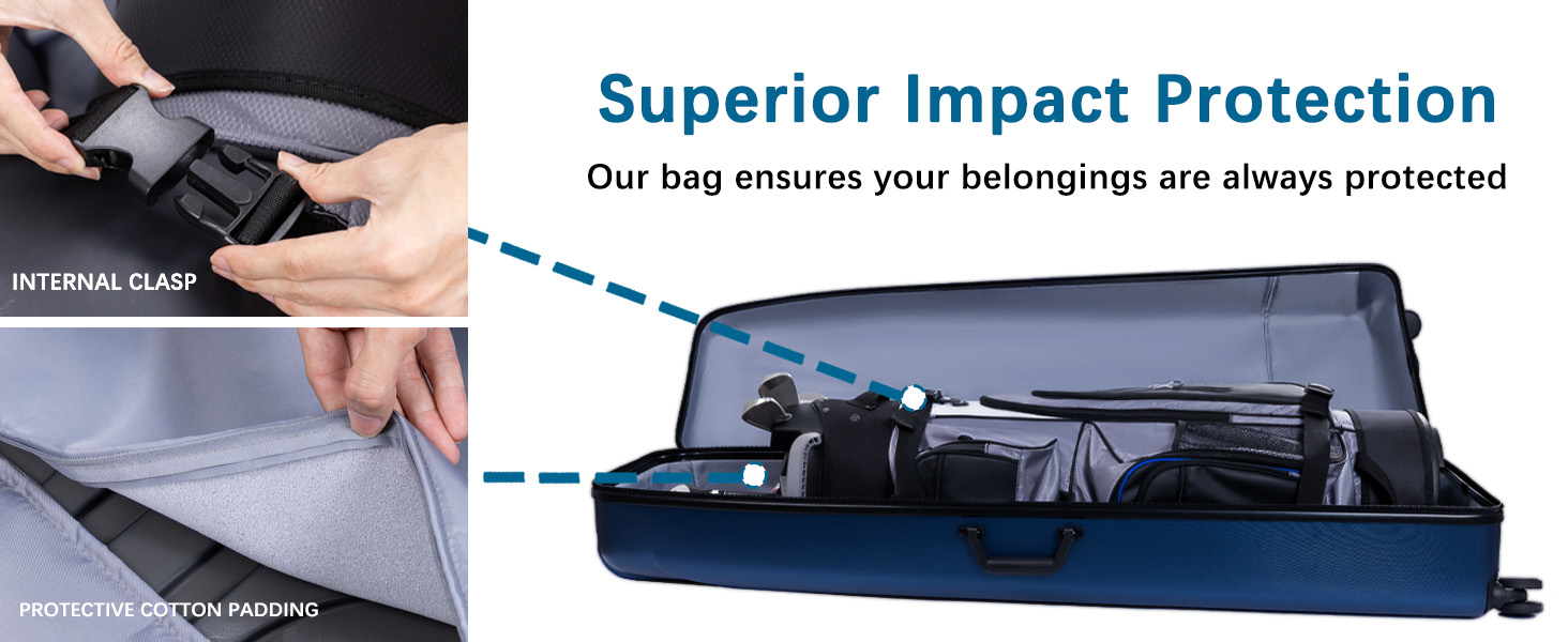 حماية كاملة للهيكل الصلب - تتميز بغطاء صلب من البولي كربونات مقاوم للتآكل ومقاوم للسحق مع بطانة داخلية سميكة، توفر حقيبة سفر الجولف هذه الحماية القصوى لنواديك أينما ذهبت. يحافظ الغلاف المقاوم للماء على أجهزتك آمنة وجافة في أي طقس.