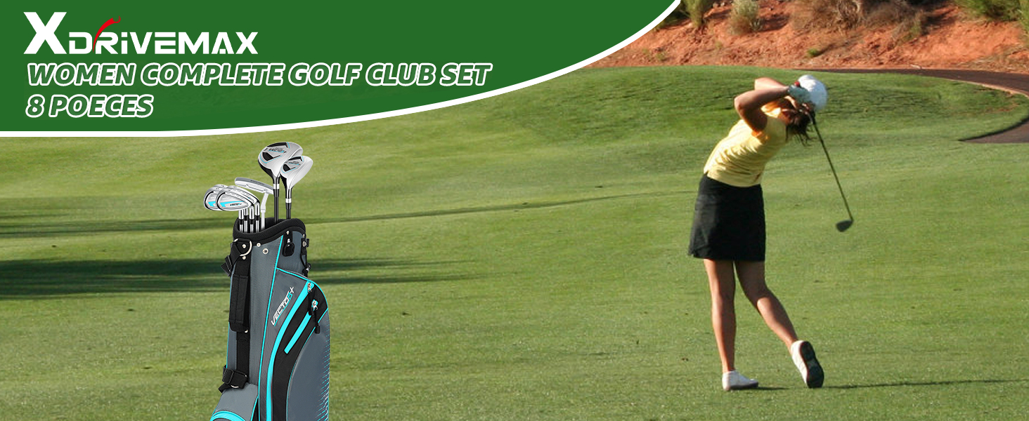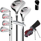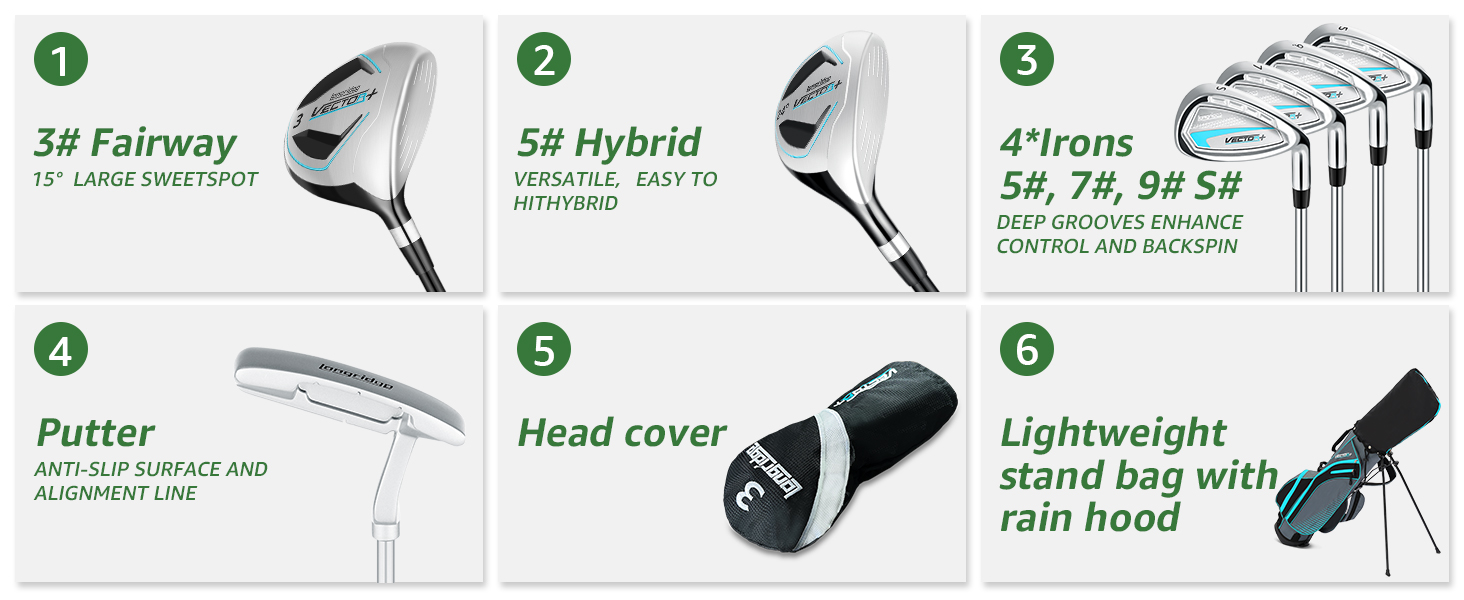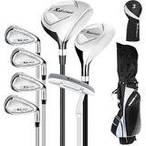 مجموعة جولف كاملة مكونة من 8 قطع: تتكون مجموعة نادي الجولف الرجالية هذه من حقيبة حامل خفيفة الوزن مع غطاء رأس، 3# ممر، 5# هجين، 5# 7# 9# مكاوي ومضرب. 3# خشب الممر مجهز بغطاء رأس لحماية أفضل