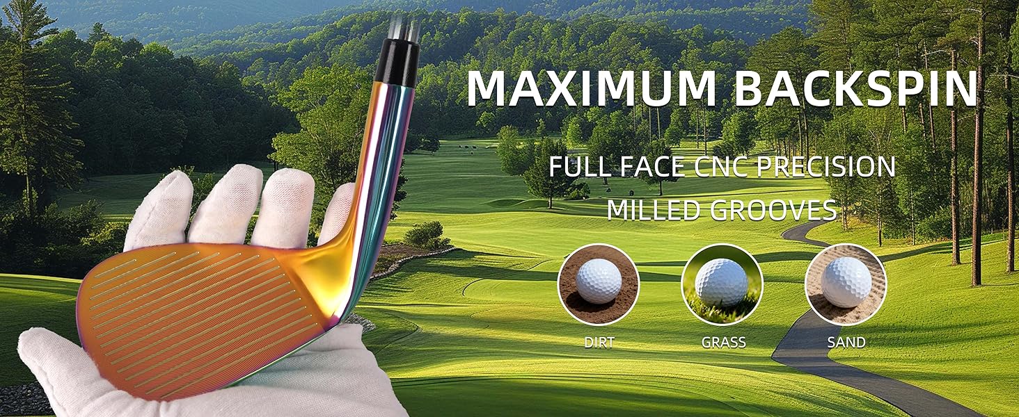 Highlighted by an innovative full-face CNC milled design with aggressive groove patterns, these golf wedges create powerful, consistent backspin. Non-sharp smooth grooves protect your golf balls from scuffs and damage, while the full-face groove layout locks in stable spin & straight trajectory for ultra-precise shots.
