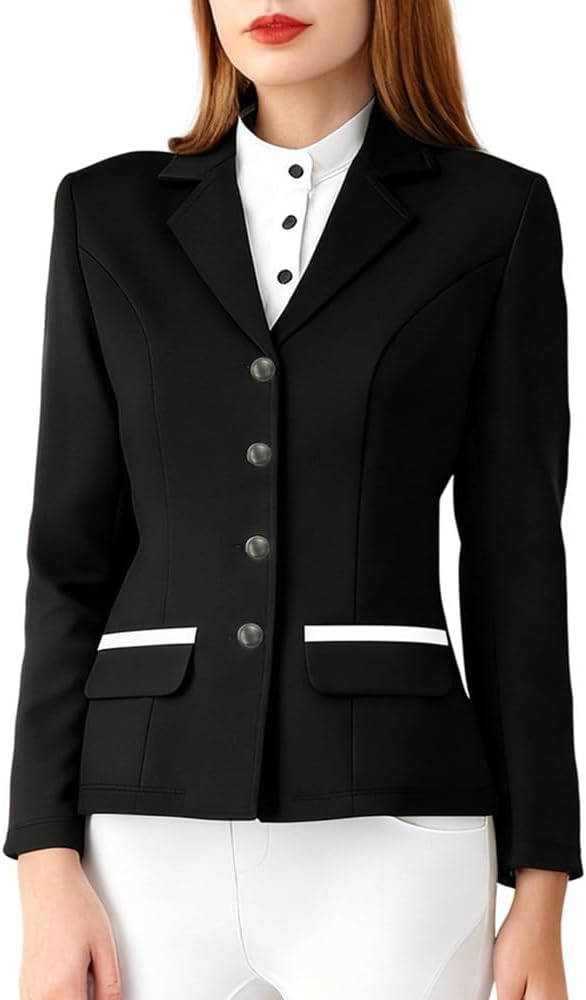 الطراز العصري والعصري: معطف عرض الفروسية النسائي الخاص بنا مع مزيج مثالي من نسيج الفصول الأربعة وشريط أبيض تفاصيل على الجيوب والياقة لإضفاء لمسة من التألق.