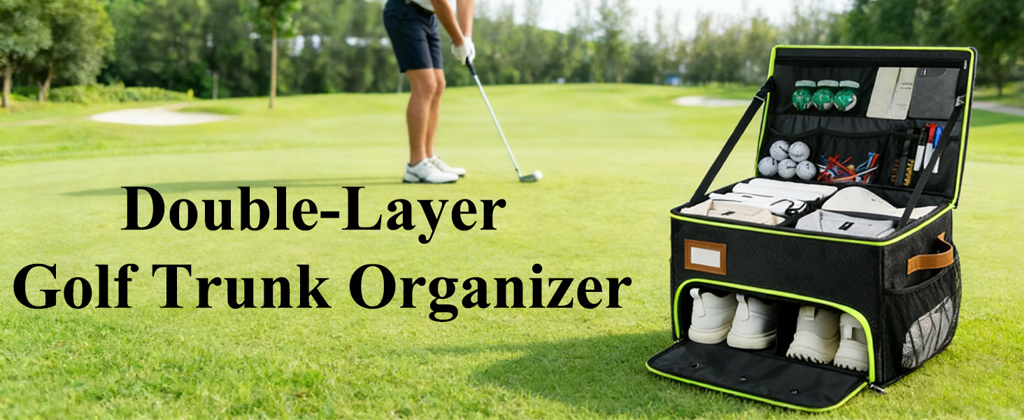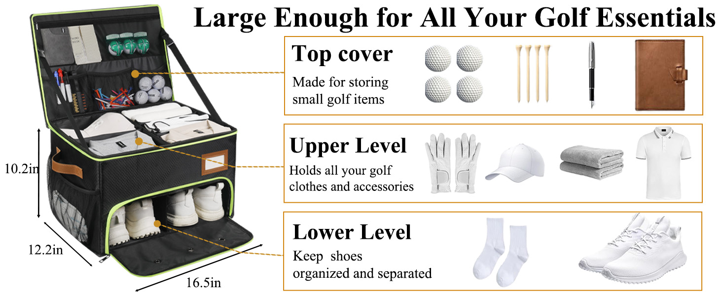 مساحات متعددة: تحتوي الطبقة العليا من منظم الجولف للسيارة على 4 أشرطة فيلكرو قابلة للتعديل لتخزين الملابس والقبعات بشكل مرن. تتميز المنطقة العلوية بـ 3 جيوب مرنة وجيب كبير بسحاب لكرات الجولف والنوادي. الطبقة السفلية تناسب زوجين من أحذية الجولف مقاس 13.