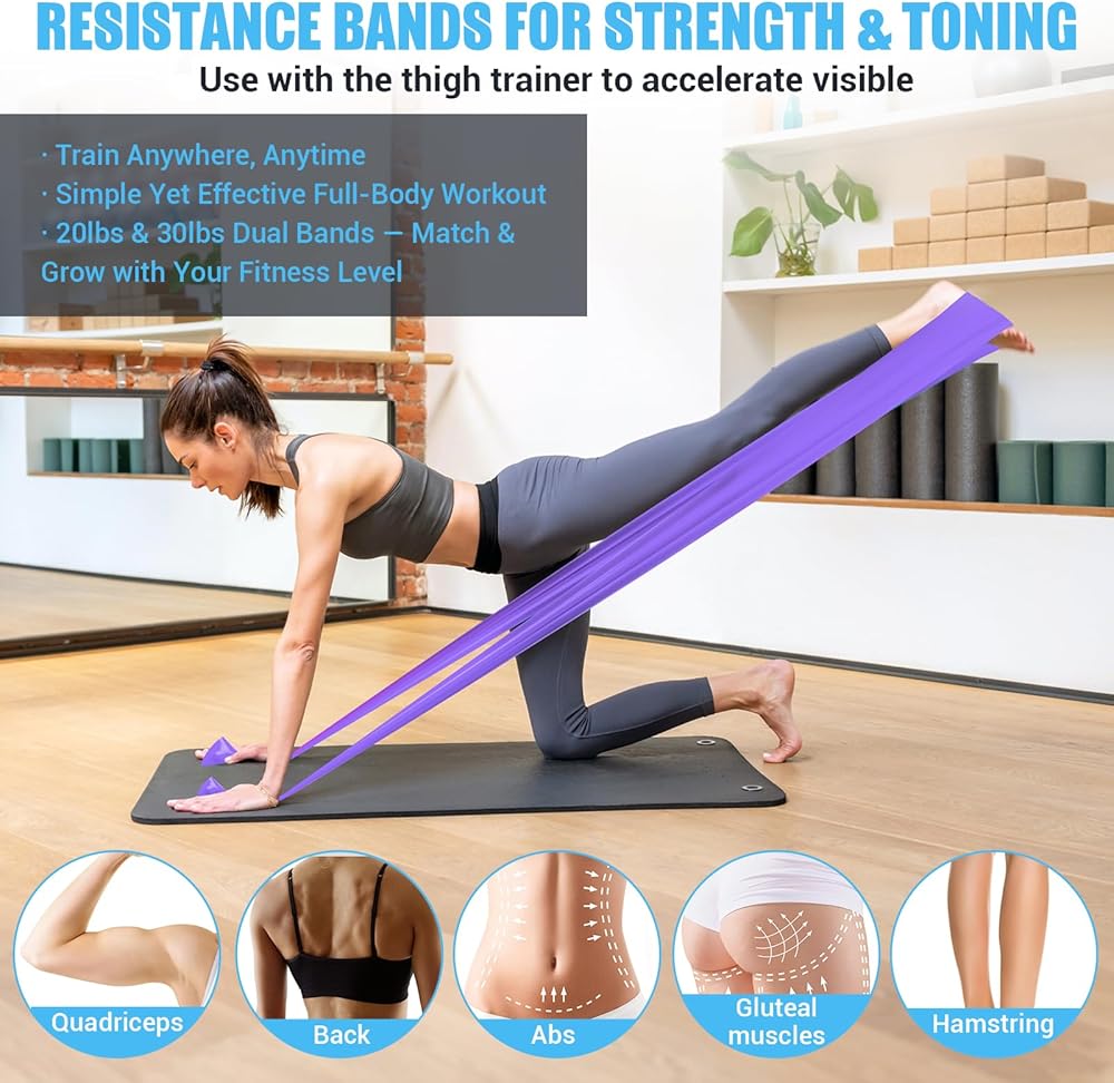 جهاز تمرين الفخذ الداخلي للنساء، مدرب فخذ مقاوم قابل للتعديل بوزن 15-80 رطل مع شريط مقاومة (قطعتين)، معدات كيجل لتمرين الفخذ لعضلات قاع الحوض، وتشكيل الجسم، واليوجا واللياقة المنزلية