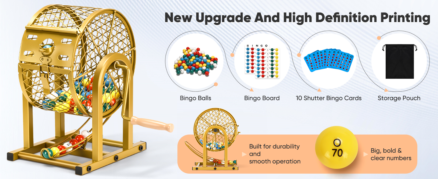 【قاعدة معززة للمتانة】تم تصميم قفص البنغو الخاص بنا لتحقيق الثبات وطول العمر، ويتميز بقاعدة محصنة وغير قابلة للانزلاق تبقيه في مكانه بشكل آمن أثناء اللعب الحماسي. بالإضافة إلى آلية الدوران السلسة، فإنها تضمن رسمًا سهلاً وأداءً موثوقًا في كل مرة. تم تصميم مجموعة ألعاب البنغو هذه من مواد فاخرة للاستخدام الدائم، وهي مصممة للتعامل مع عدد لا يحصى من الألعاب مع تشغيل متسق وخالي من المتاعب.