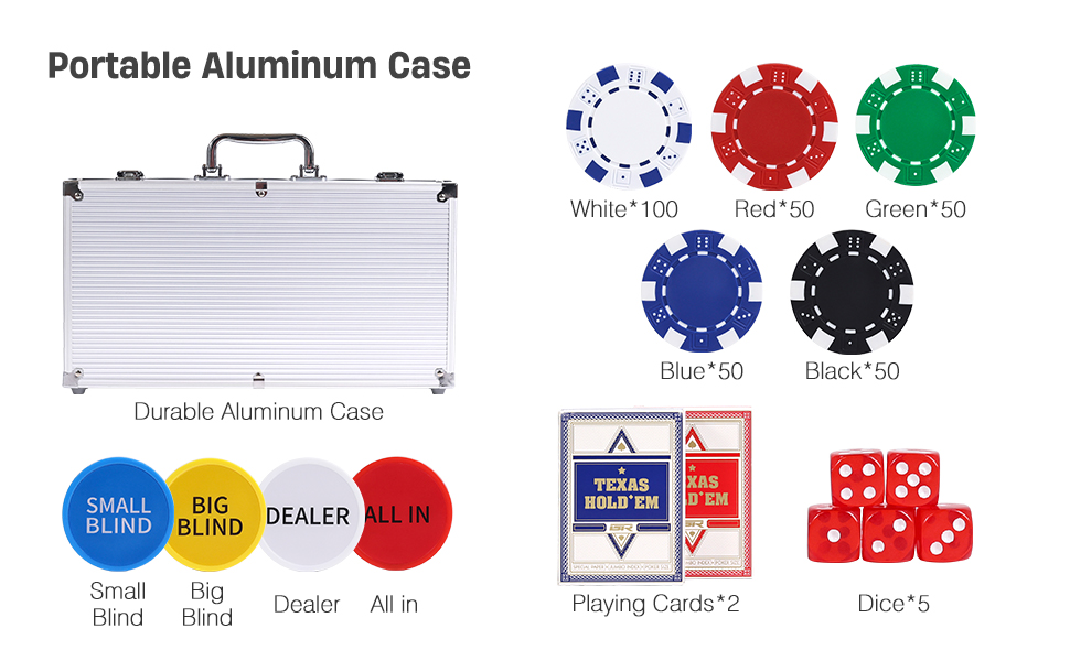 【تفاصيل المجموعة】- مجموعة فارغة مكونة من 300 قطعة: 100 أبيض، 50 أحمر، 50 أخضر، 50 أزرق، 50 أسود + 2 مجموعة بطاقات، 4 أزرار ألعاب، 5 نرد وحقيبة حمل للرقائق.