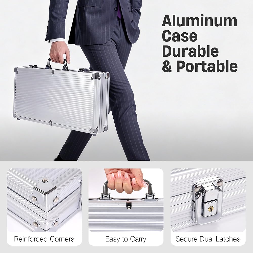 【حافظة من الألومنيوم】- حافظة محمولة من سبائك الألومنيوم المعززة، مجهزة بأجزاء تخزين وبطانة داخلية ناعمة، لضمان سلامة الرقائق أثناء النقل.