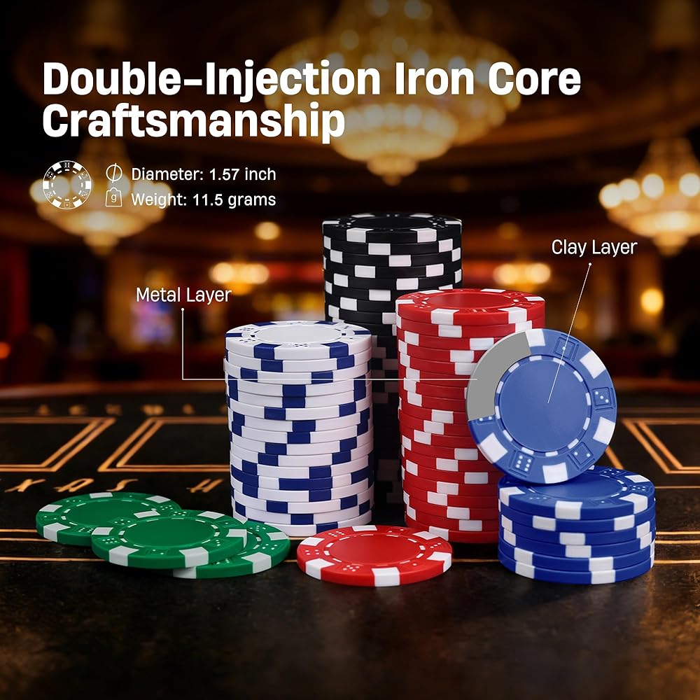 【رقائق احترافية】- تزن كل شريحة 11.5 جرامًا وقطرها 40 مم، مصنوعة من مادة مركبة من الطين عالية الجودة من خلال عملية قلب حديد مزدوجة الحقن.
