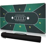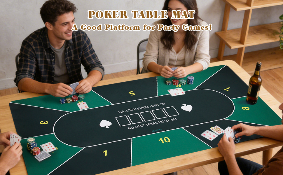 Nice Poker Mat: This poker table topper is soild and well made. with non slip rubber base and soft surface, heavy, thick and No creases, nicks or smell. الحجم 70 × 35 بوصة، مناسب لأي طاولة مثل طاولة بطول 6 أقدام أو 8 أقدام، ويمكن أن يستوعب ما يصل إلى 8 إلى 12 لاعبًا وهو رائع للتجمعات الكبيرة أو حفلات البوكر.