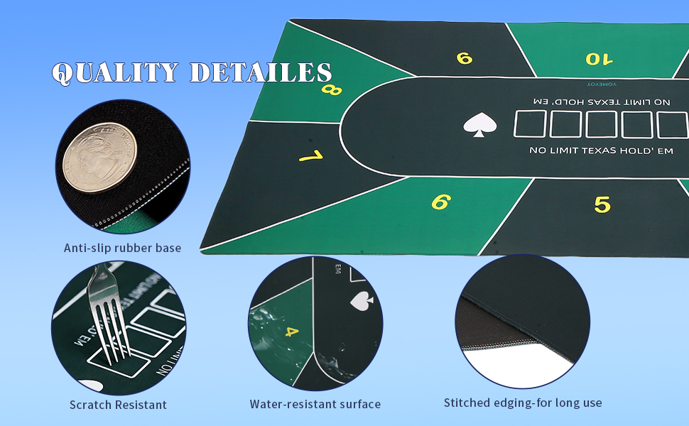 محمولة وسهلة الحمل: يمكن طيها بسهولة وتخزينها أو أخذها إلى أي مكان تريده، سجادة بلاك جاك هذه مخيطة بشكل جيد للغاية، ويمكن استخدامها لفترة طويلة. يمكنك لعب البطاقات بشكل أفضل مع مفرش طاولة البوكر هذا.