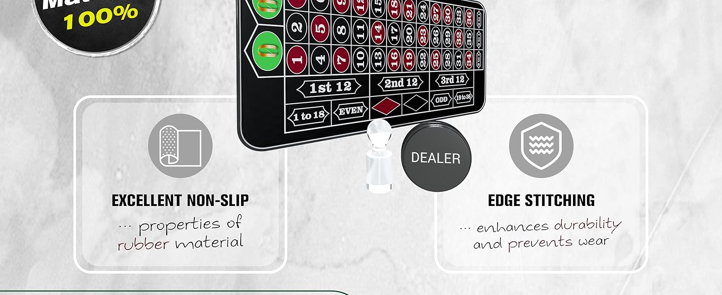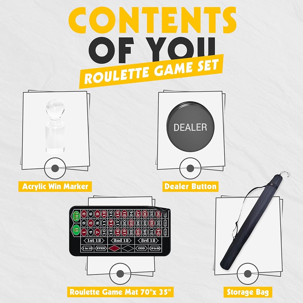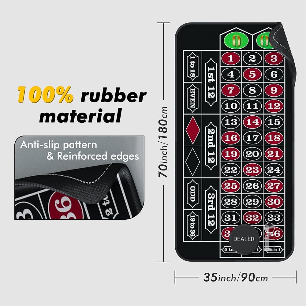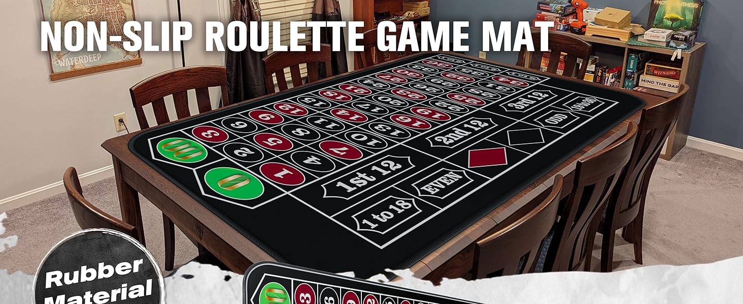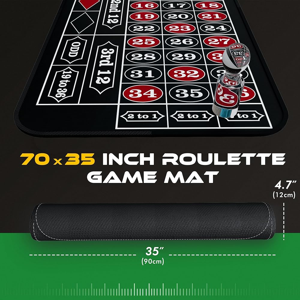 【محتويات مجموعة اللعبة الخاصة بك】: حصيرة الروليت مقاس 70 بوصة × 35 بوصة، علامة فوز أكريليك، زر الموزع