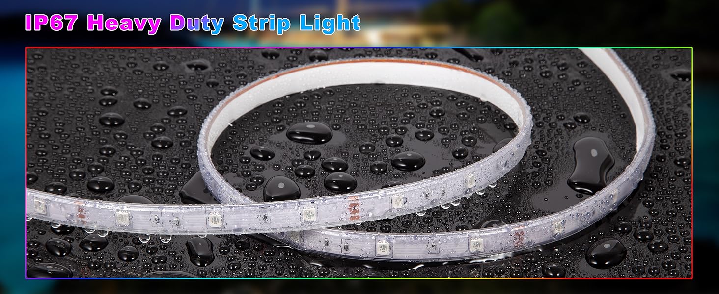 شريط بحري مقاوم للماء IP67: تم تصميمه من أجل المتانة، يتميز شريط ضوء القارب LED 12 فولت بتصنيف IP67 المقاوم للماء، مما يسمح له بتحمل الغمر في ما يصل إلى متر واحد من الماء لمدة 30 دقيقة. بالإضافة إلى ذلك، فإن الاتصال بين وحدة التحكم والسلك مقاوم للماء والمطر والغبار، ويمكن تركيبه بثقة، سواء داخل قاربك أو خارجه.