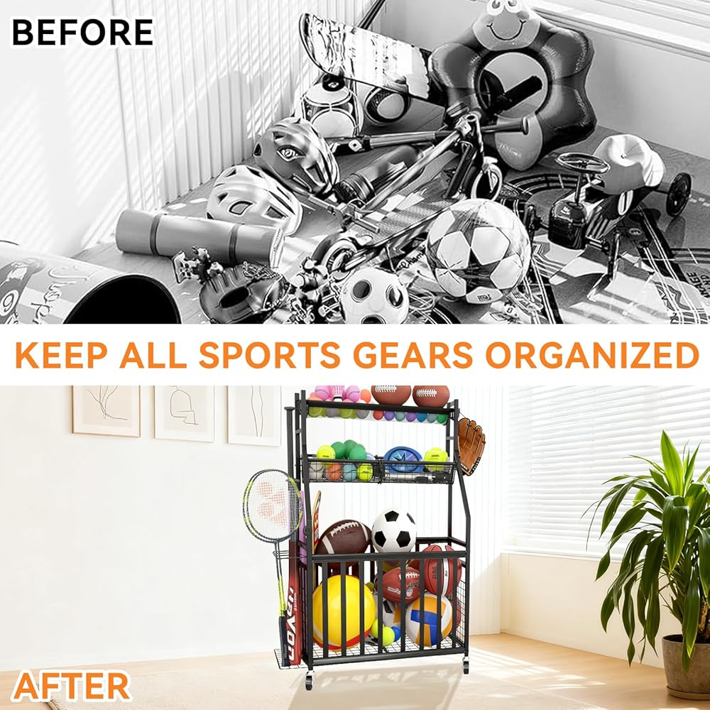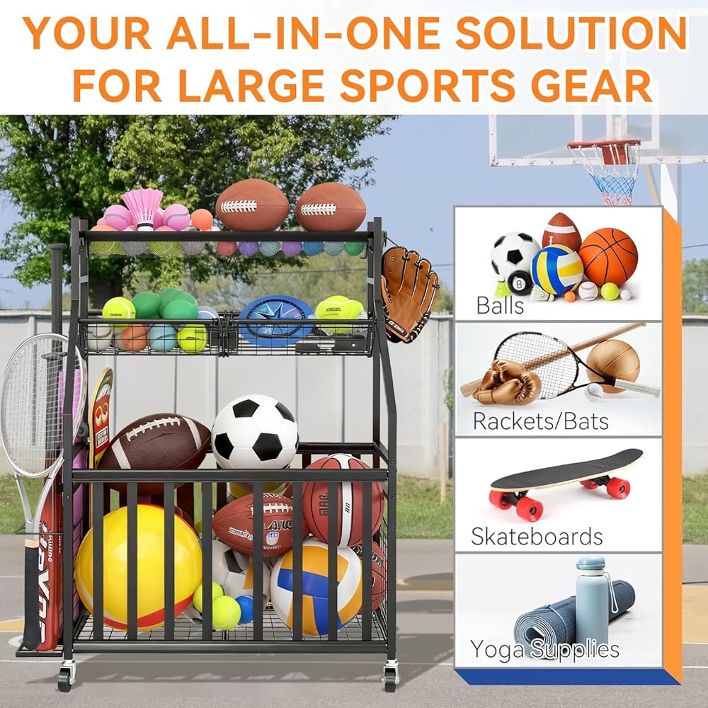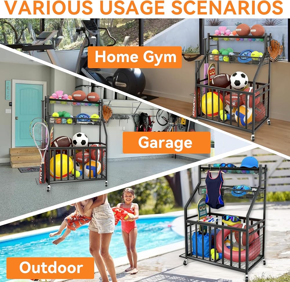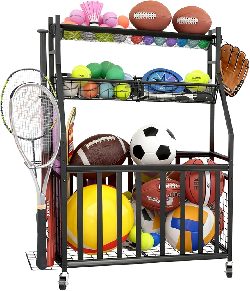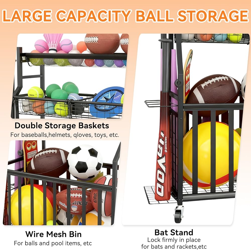 منظم جراج المعدات الرياضية، رف رياضي داخلي/خارجي للجراج، منظم تخزين الكرات مع سلة وخطافات وعجلات، تخزين الألعاب/المعدات الرياضية